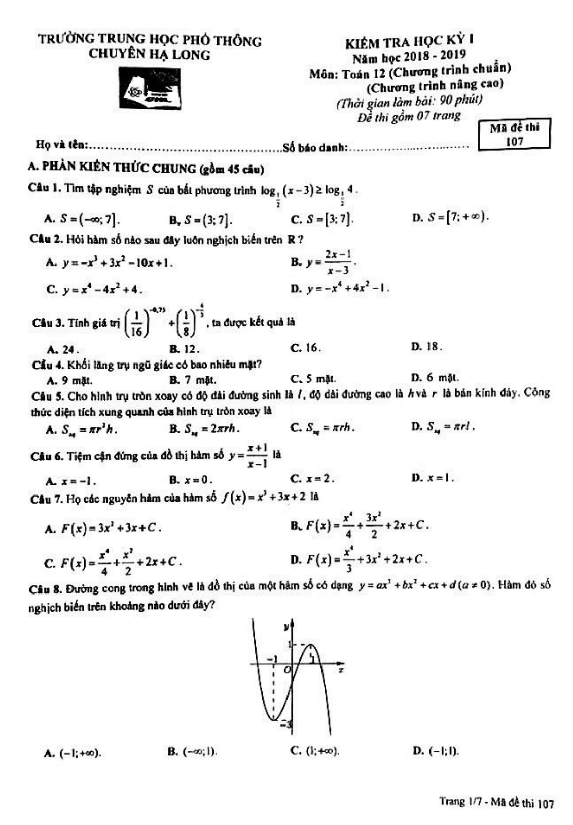 Đề thi học kì 1 lớp 12 môn Toán năm 2018 - 2019 trường THPT Chuyên Hạ Long - Quảng Ninh