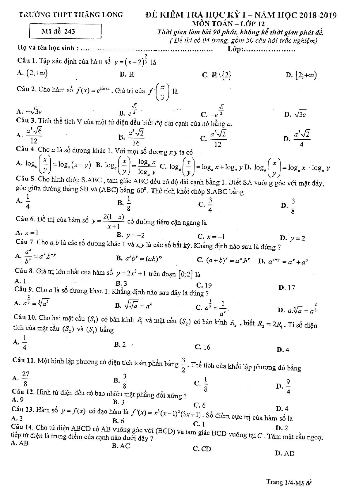 Đề thi học kì 1 lớp 12 môn Toán năm 2018 - 2019 trường THPT Thăng Long - Hà Nội