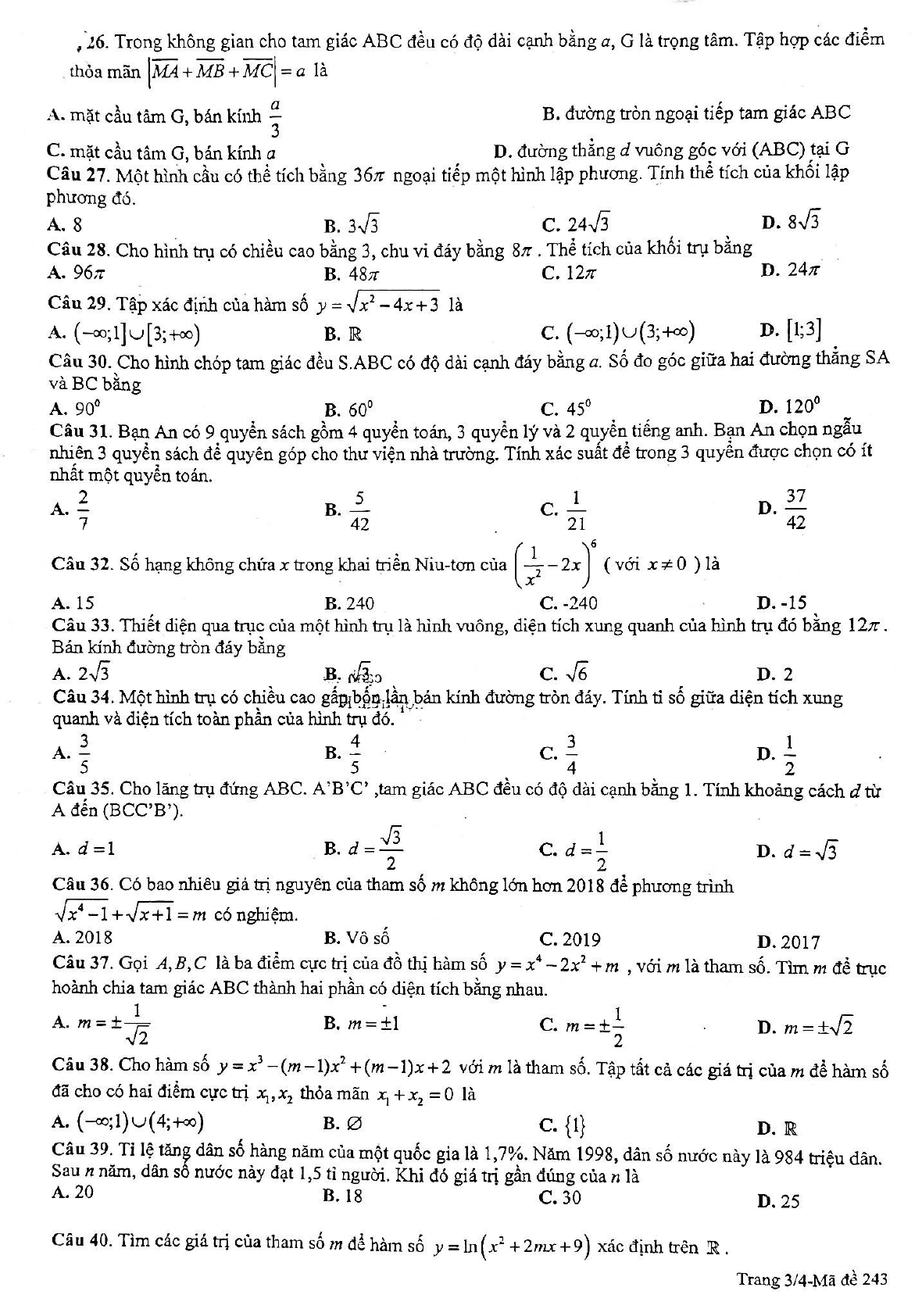 Đề kiểm tra môn Toán 12 năm 2018 - 2019