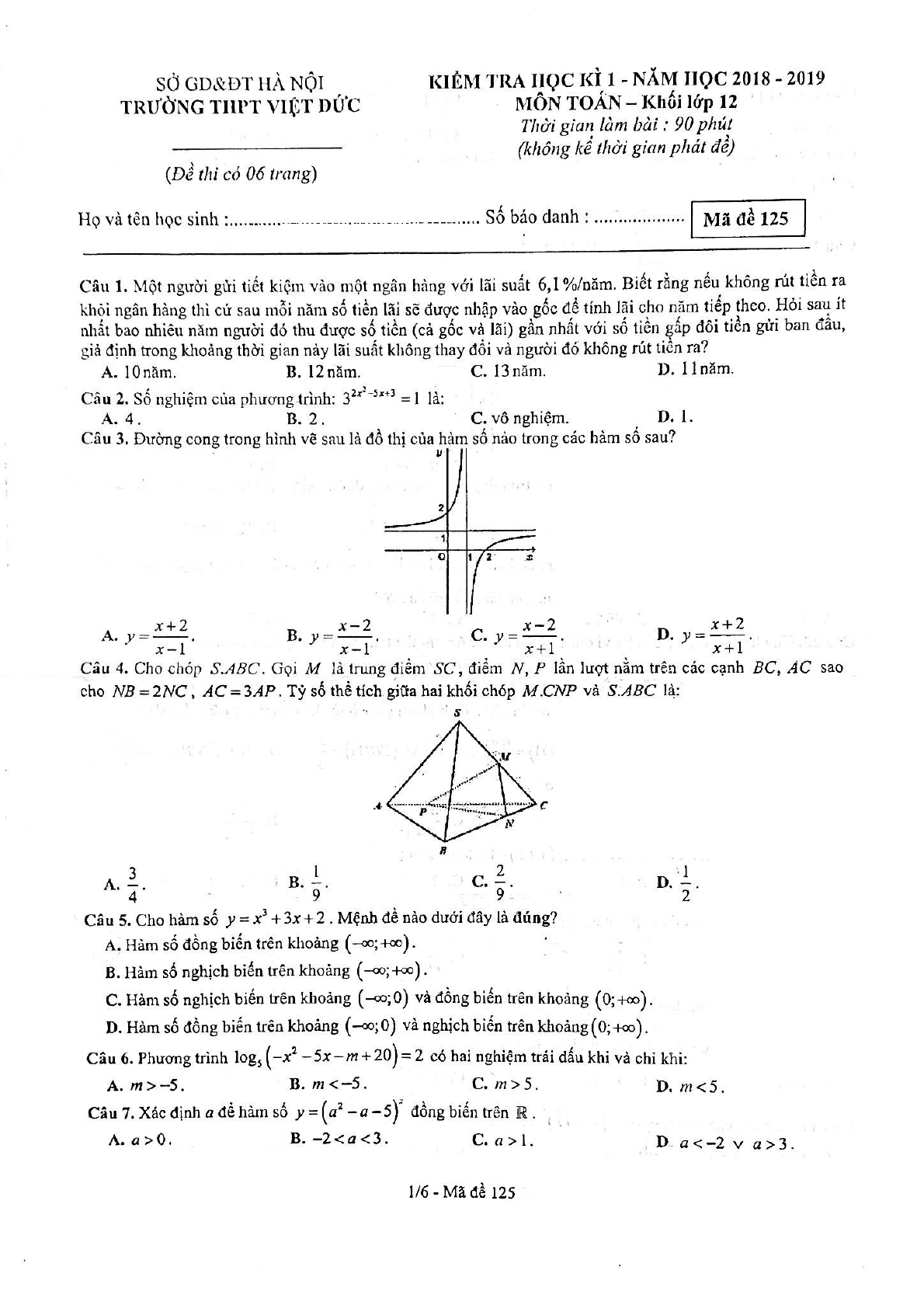 Đề thi học kì 1 lớp 12 môn Toán năm 2018 - 2019 trường THPT Việt Đức - Hà Nội