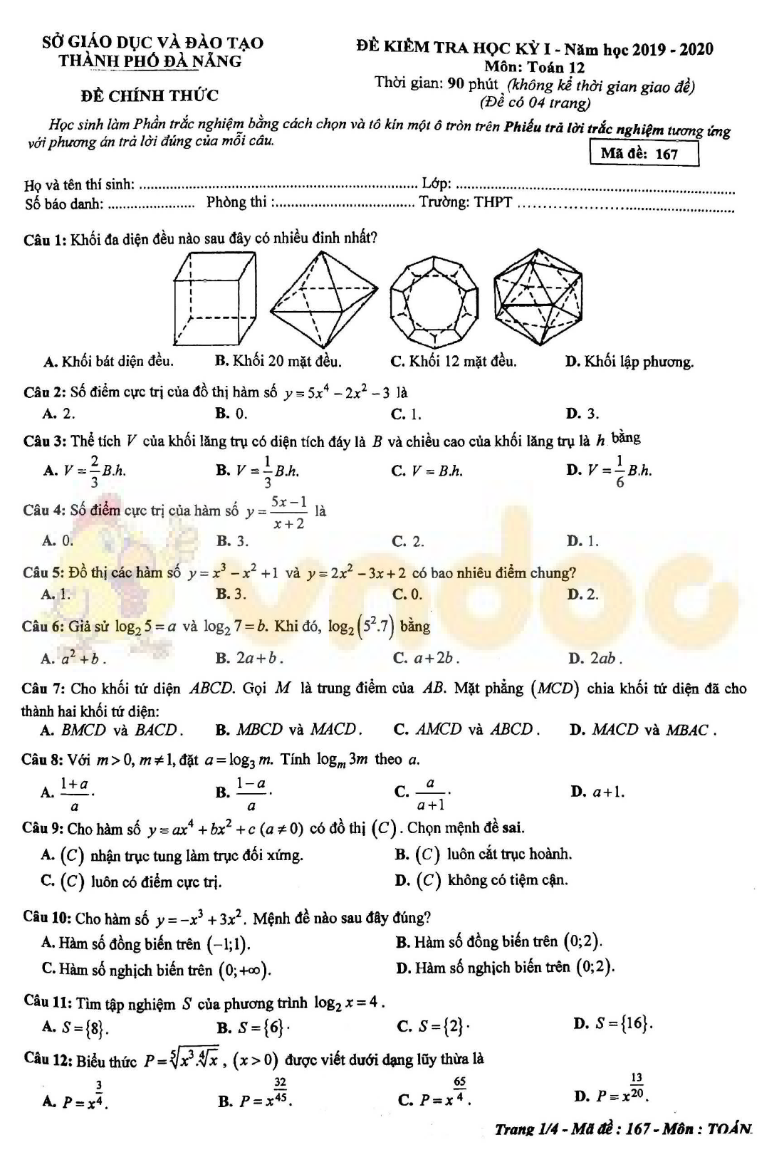 Đề thi học kì 1 lớp 12 môn Toán Sở GD&ĐT Đà Nẵng năm học 2019-2020