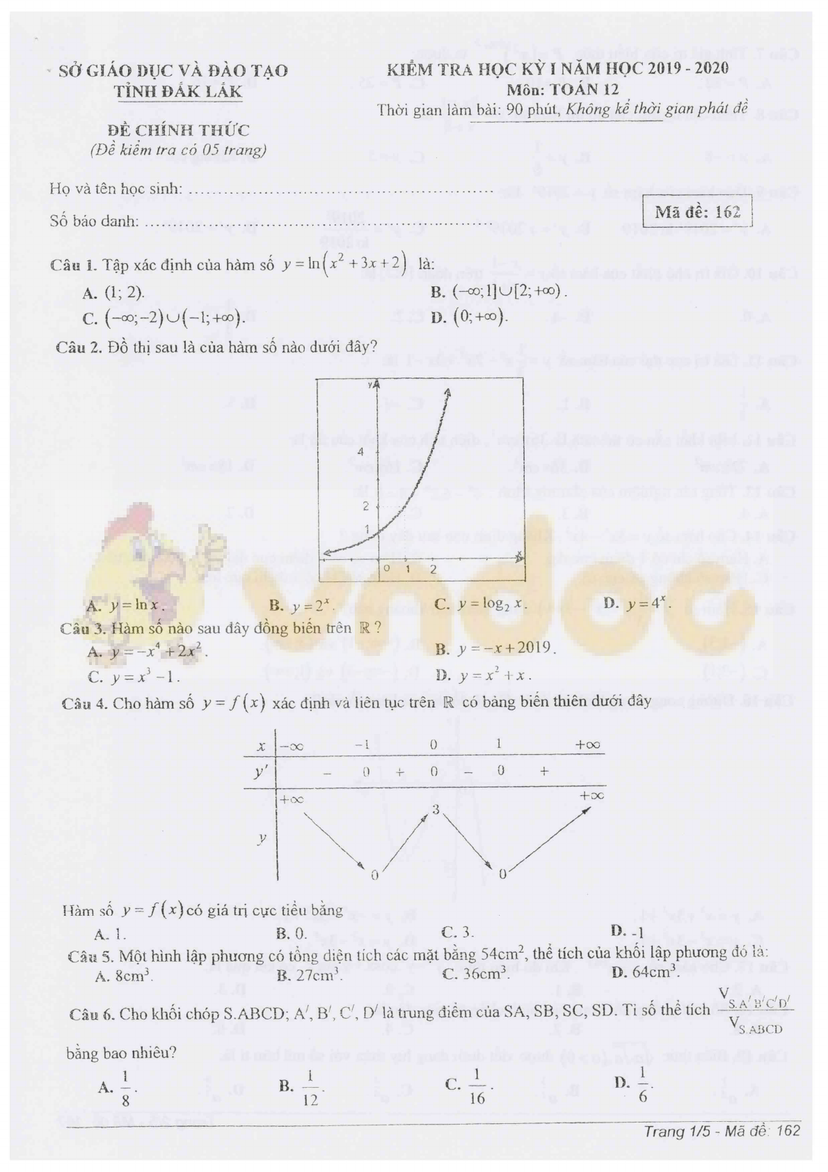 Đề thi học kì 1 lớp 12 môn Toán Sở GD&ĐT Đắk Lắk năm học 2019-2020