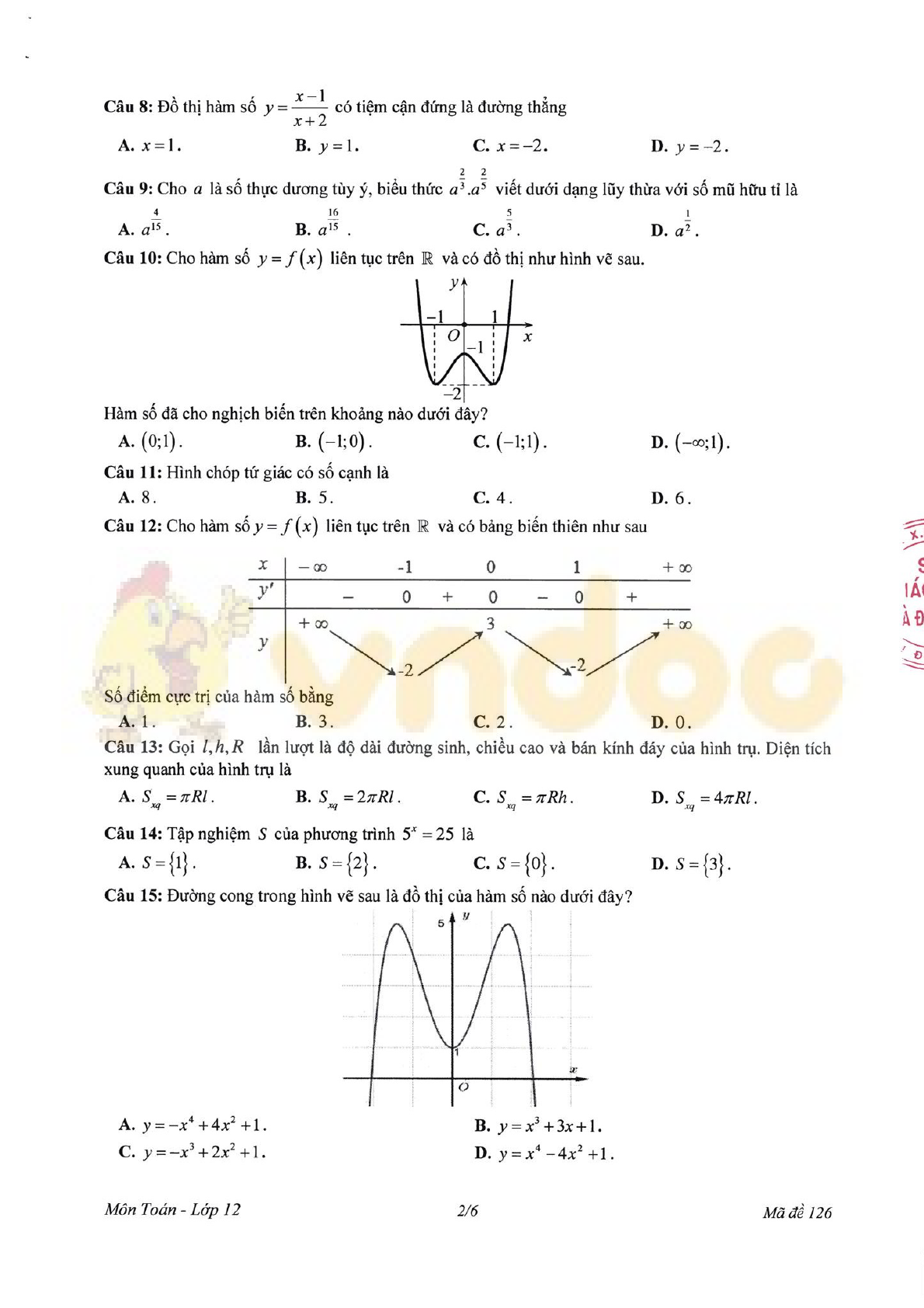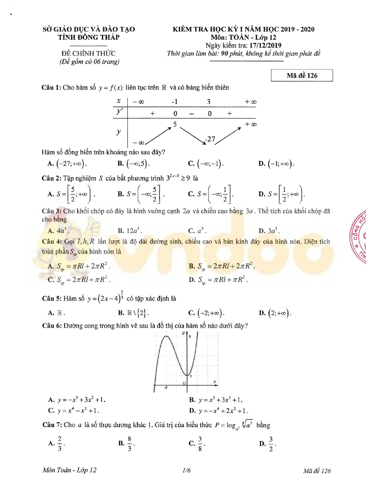 Đề thi học kì 1 lớp 12 môn Toán Sở GD&ĐT Đồng Tháp năm học 2019-2020 vừa được VnDoc.com sưu tập và xin gửi tới bạn đọc để bạn đọc cùng tham khảo. Đề thi gồm có 6 trang, tổng hợp 50 câu trắc nghiệm khách quan và thí sinh làm đề trong thời gian 90 phút. Đề thi được biên soạn theo hình thức giống với đề thi THPT Quốc gia các năm trước. Mời bạn đọc cùng tham khảo chi tiết tại đây.