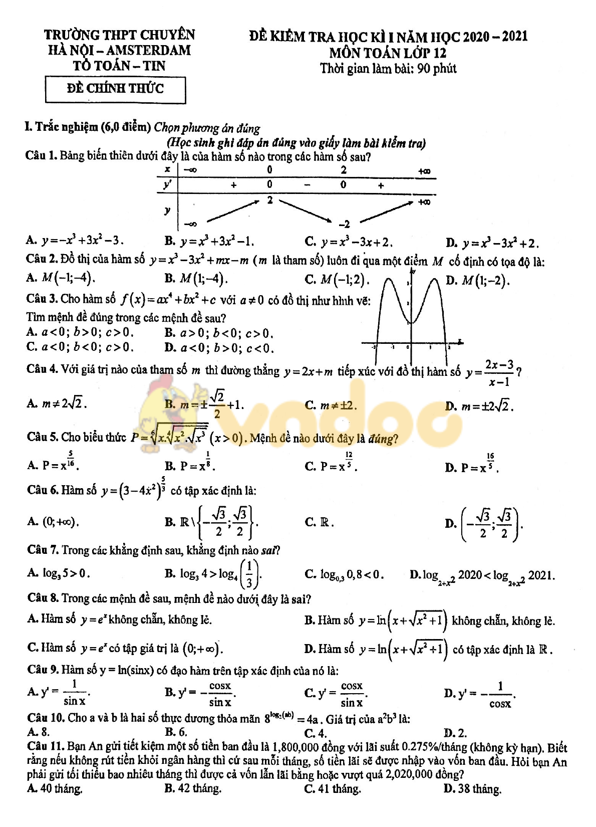VnDoc giới thiệu Đề thi học kì 1 lớp 12 môn Toán trường THPT chuyên Hà Nội Amsterdam năm 2020 bao gồm cả trắc nghiệm và tự luận, là tài liệu hay giúp các em học sinh ôn luyện, chuẩn bị cho kì thi chính thức sắp tới đạt kết quả cao.