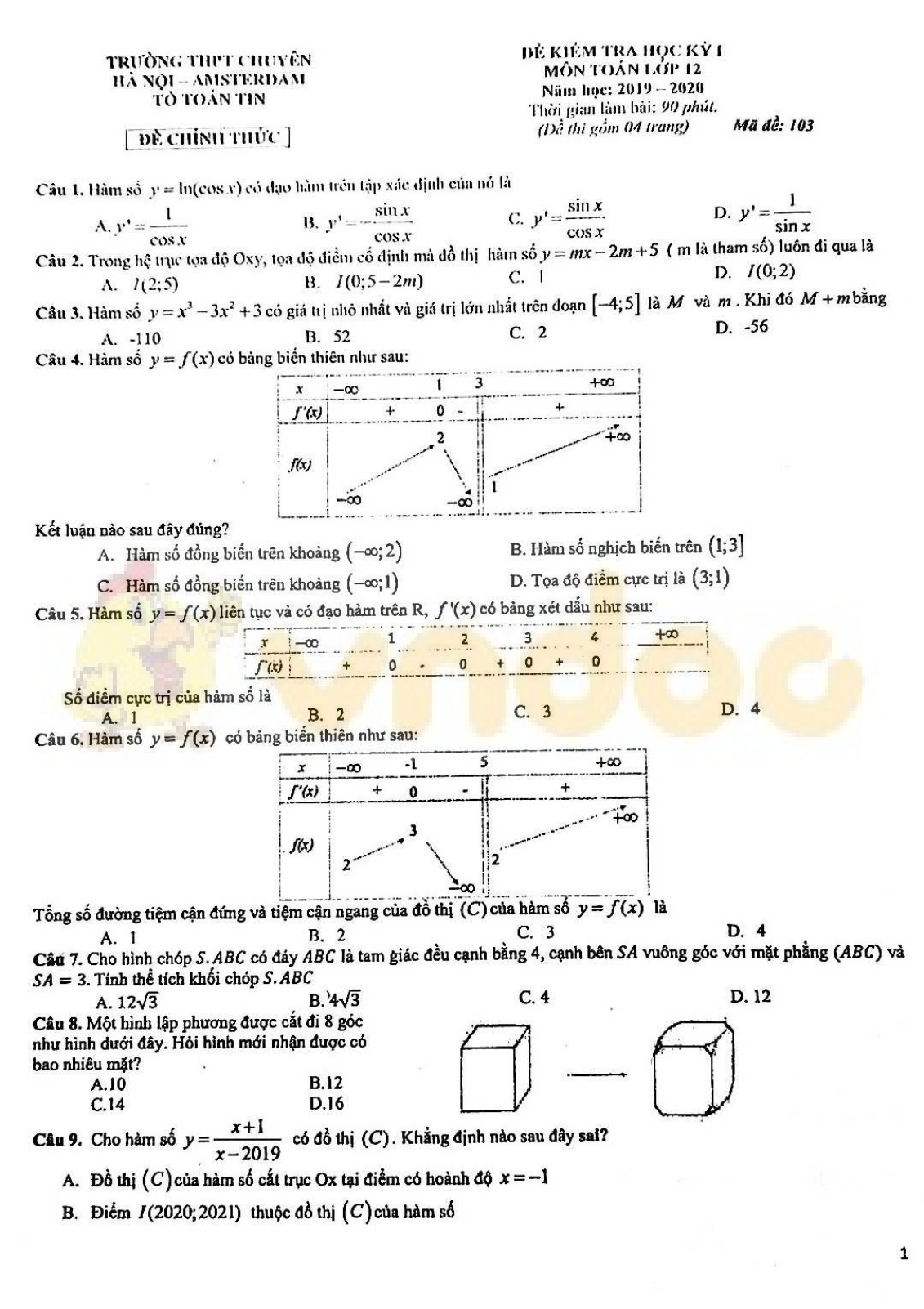 Đề thi học kì 1 lớp 12 môn Toán trường THPT Chuyên Hà Nội - Amsterdam năm học 2019-2020
