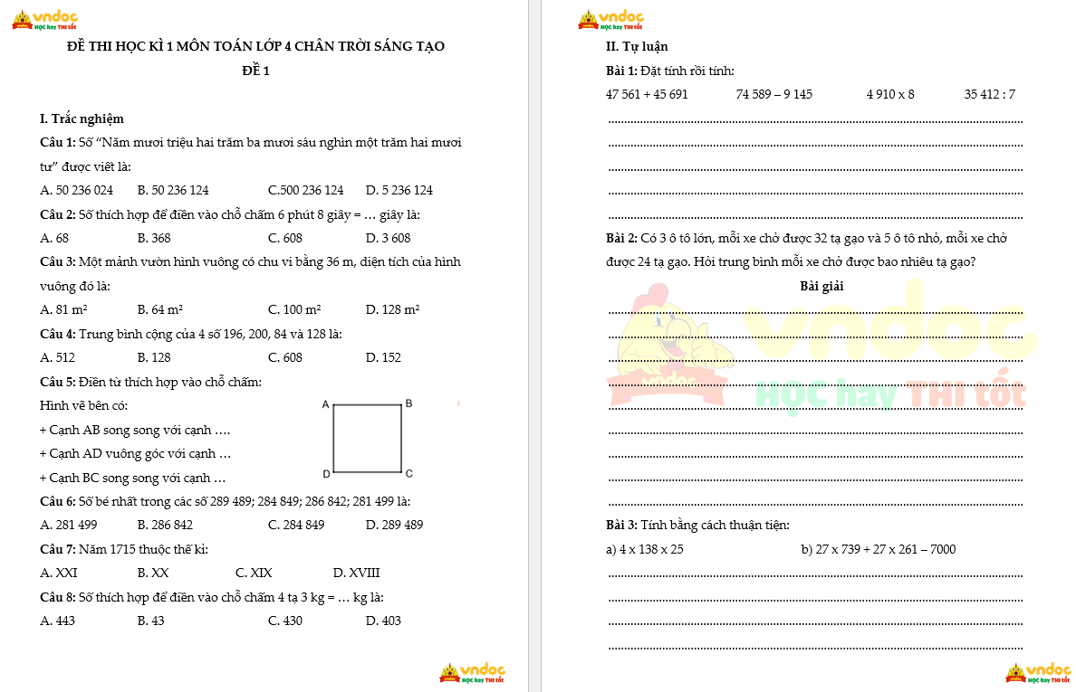 → Xem thêm: Bộ 5 đề thi học kì 1 môn Toán lớp 4 sách Chân trời sáng tạo Số 3