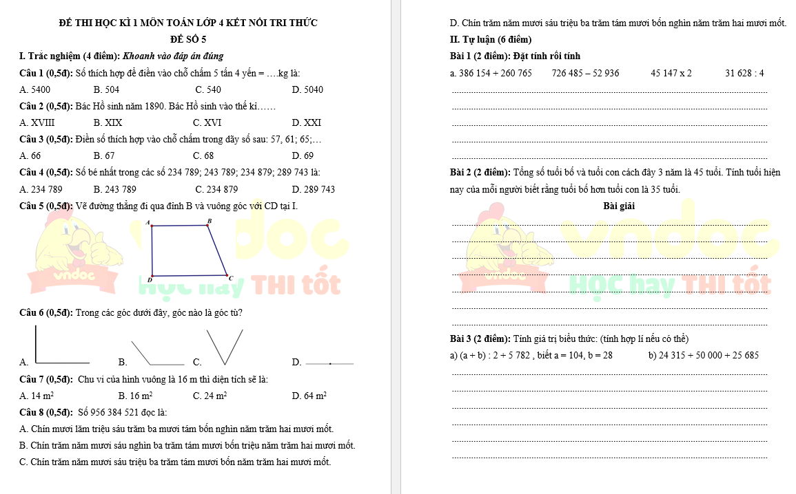 Hình ảnh minh họa cho Đề thi học kì 1 Toán lớp 4 Kết nối - Đề số 5: