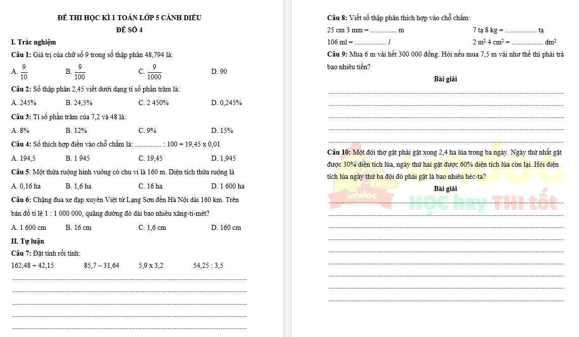 Dưới đây là hình ảnh minh họa cho Đề thi học kì 1 Toán lớp 5 Cánh diều – Đề 4: