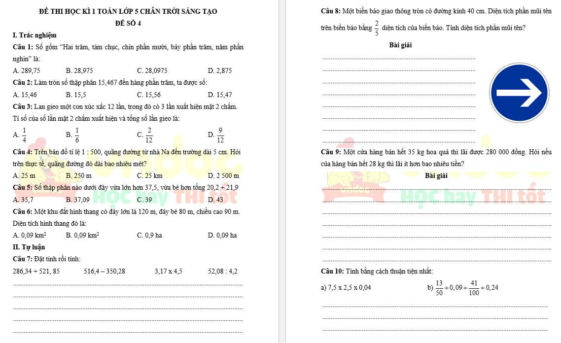 Đề thi học kì 1 lớp 5 môn Toán - Đề số 4 sách Chân trời sáng tạo do VnDoc biên soạn nhằm giúp các em ôn tập và rèn luyện các kĩ năng làm bài kiểm tra để chuẩn bị cho kì thi học kì 1 lớp 5. Đề thi gồm các dạng câu hỏi Trắc nghiệm và Bài tập được biên soạn bám sát chương trình học theo thông tư 27. Học sinh có thể làm bài trực tiếp vào đề mà không cần chuẩn bị thêm giấy ô li. Mời các em tham khảo tài liệu.