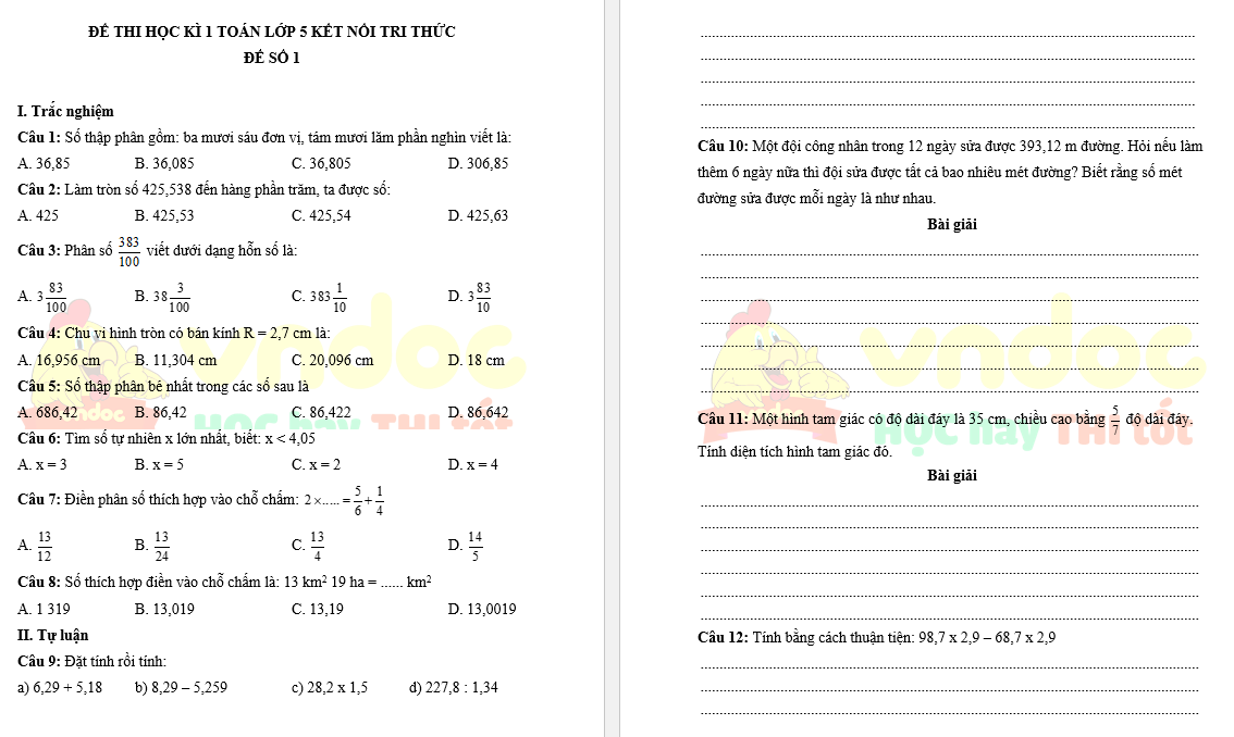 Đề thi học kì 1 lớp 5 môn Toán - Đề số 1 sách Kết nối tri thức do VnDoc biên soạn nhằm giúp các em ôn tập và rèn luyện các kĩ năng làm bài kiểm tra để chuẩn bị cho kì thi học kì 1 lớp 5. Đề thi gồm các dạng câu hỏi Trắc nghiệm và Bài tập được biên soạn bám sát chương trình học theo thông tư 27. Học sinh có thể làm bài trực tiếp vào đề mà không cần chuẩn bị thêm giấy ô li. Mời các em tham khảo tài liệu.