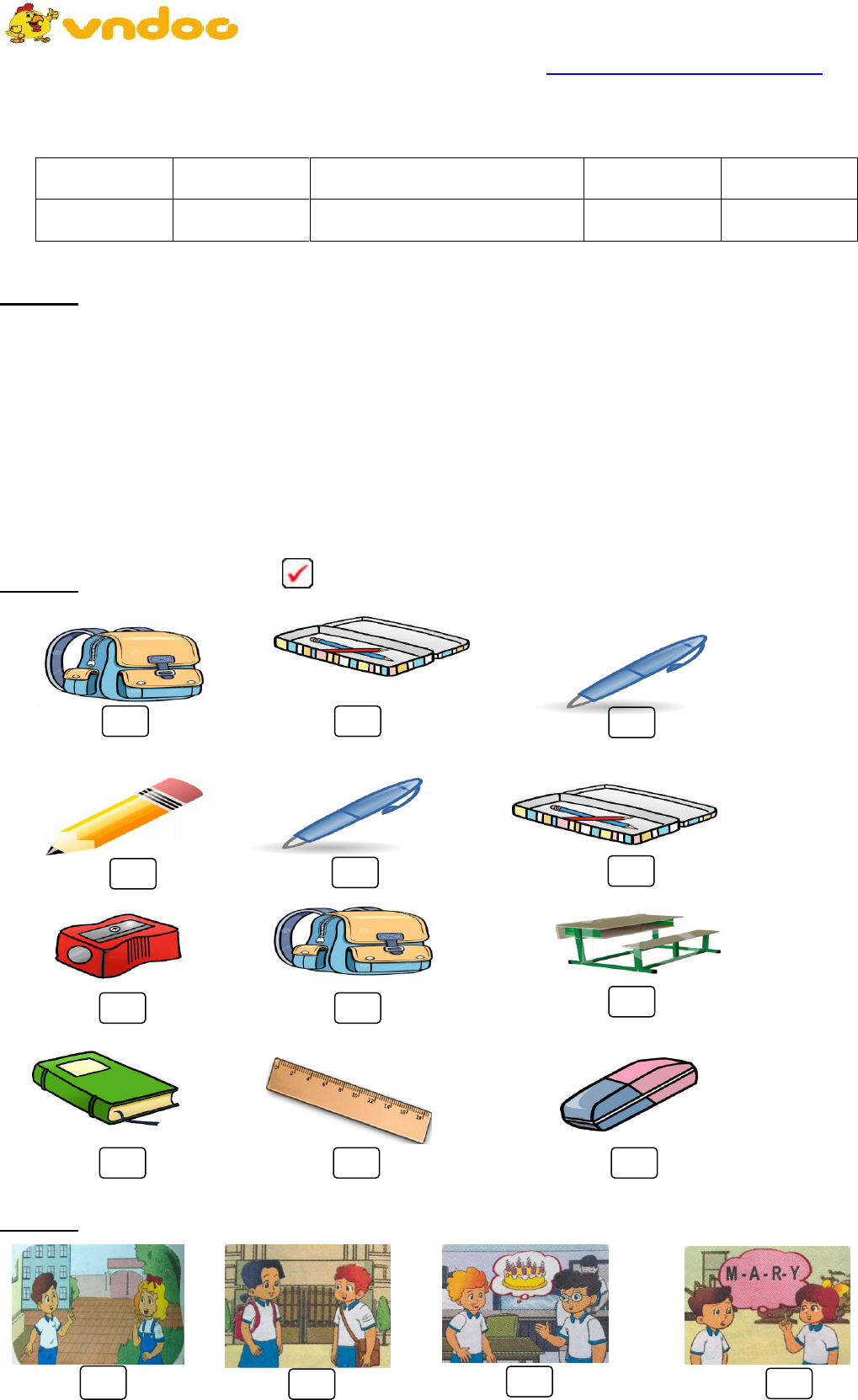 Đề thi học kì 1 môn tiếng Anh lớp 3 trường Tiểu học Nơ Trang Lơng, Đắk Lắk năm học 2018 - 2019 là tài liệu ôn thi học kì 1 lớp 3 hay được VnDoc.com thu thập và tổng hợp nhằm giúp các em ôn thi hiệu quả. Sau đây mời các em cùng làm bài nhé!