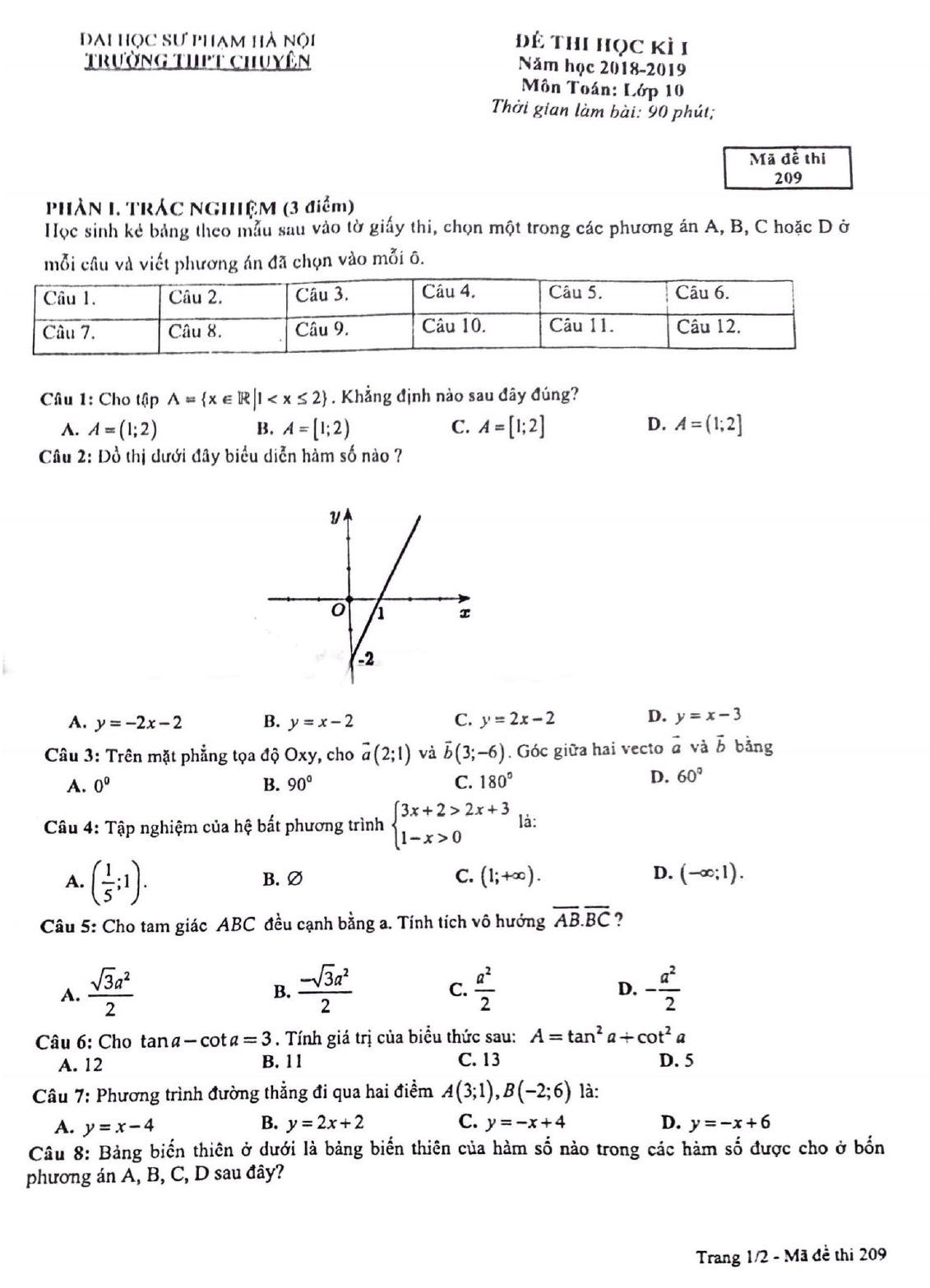 Đề thi học kì 1 Toán 10 năm 2018 - 2019 trường THPT chuyên ĐHSP - Hà Nội