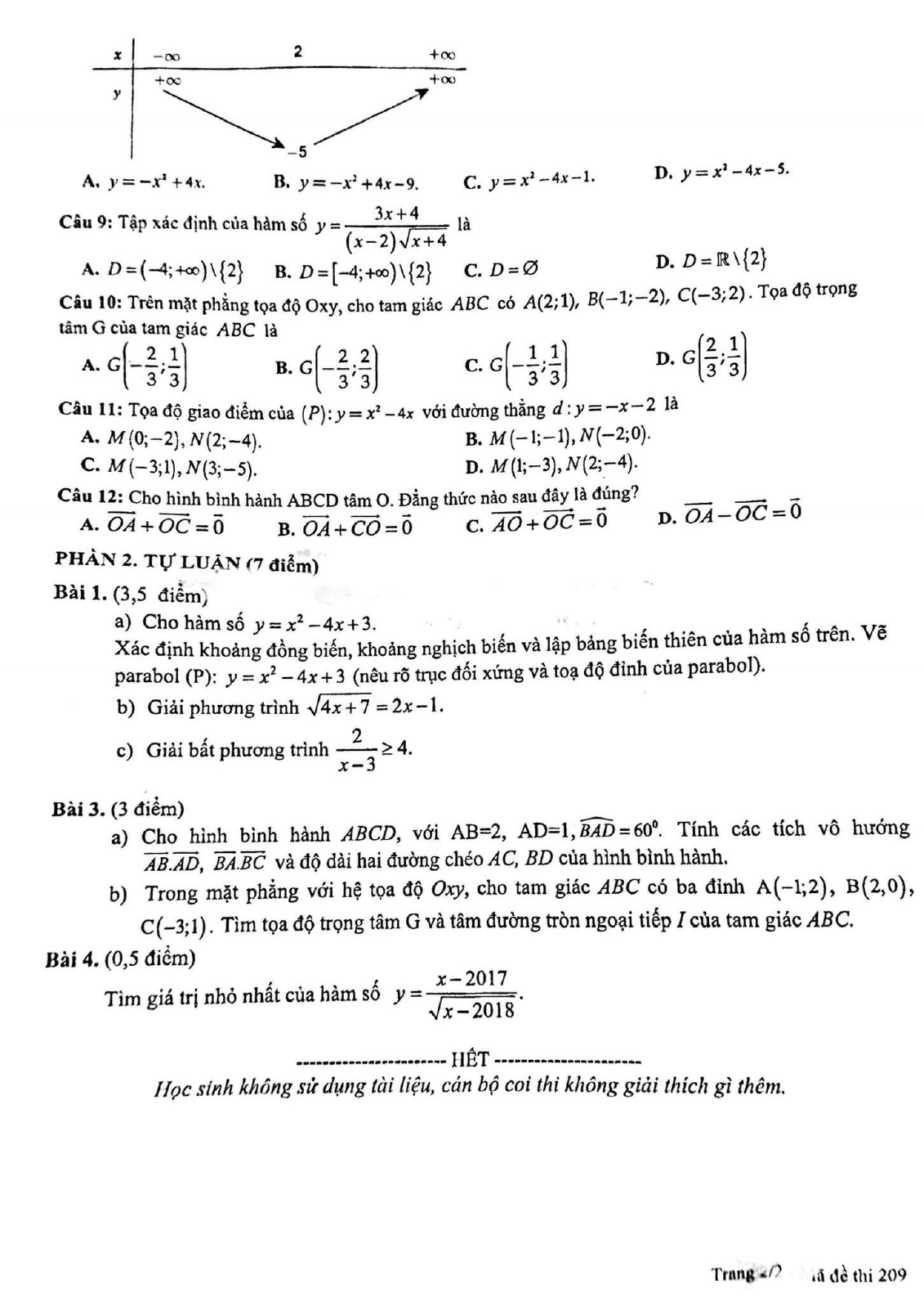 Đề thi học kì 1 lớp 10 môn Toán năm 2018 - 2019