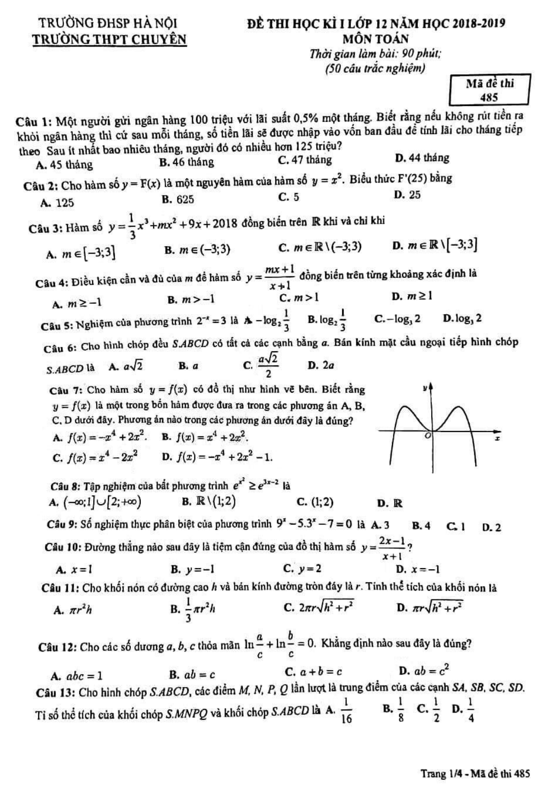 Đề thi học kì 1 Toán 12 năm 2018 - 2019 trường THPT chuyên ĐHSP - Hà Nội