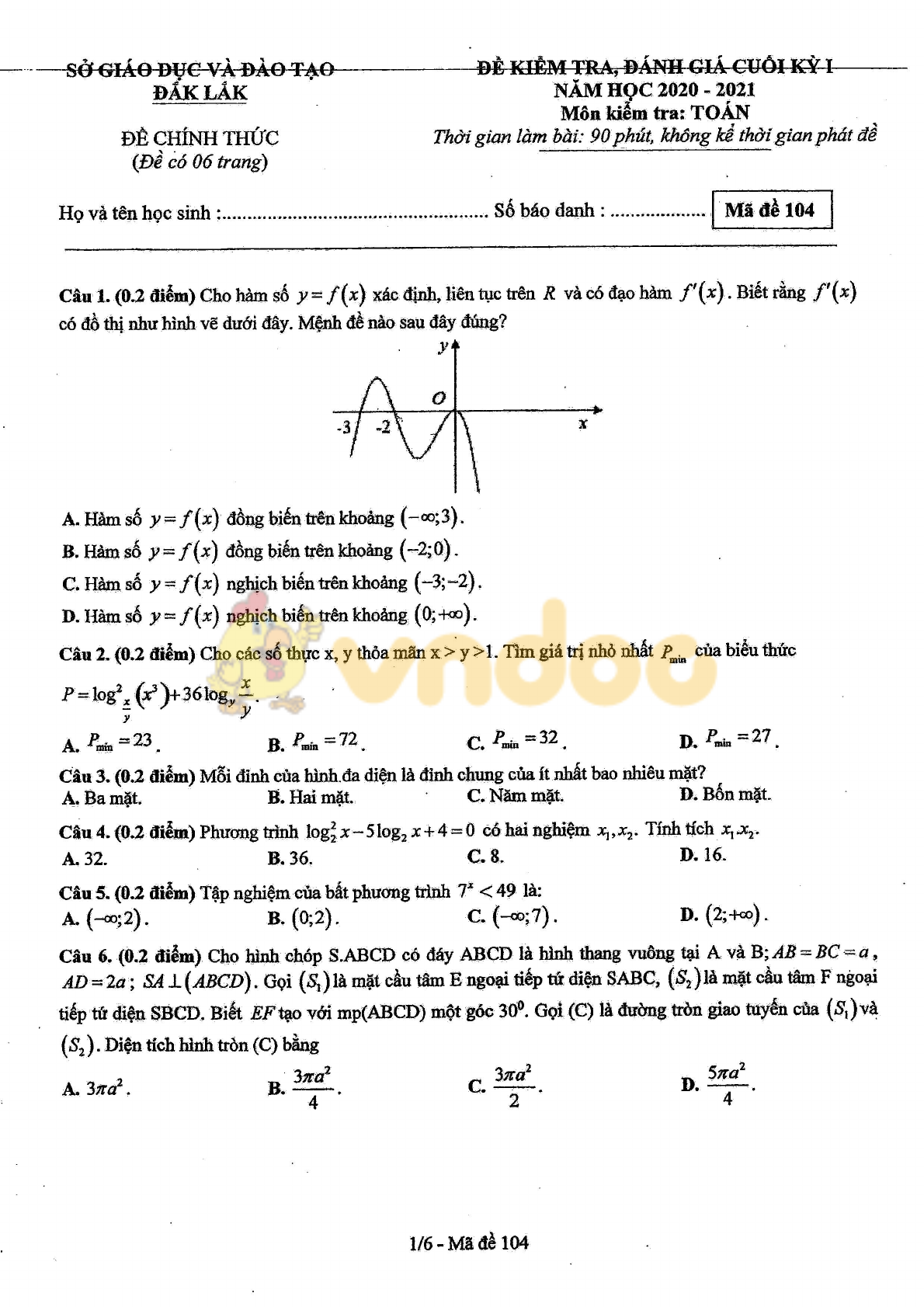 Trên đây VnDoc.com vừa giới thiệu tới các bạn Đề thi học kì 1 lớp 12 môn Toán Sở GD&ĐT Đắk Lắk năm 2020. Mời các bạn cùng tham khảo thêm kiến thức các môn Ngữ văn 12, Tiếng Anh 12, đề thi học kì 2 lớp 12... được cập nhật liên tục trên VnDoc.com.