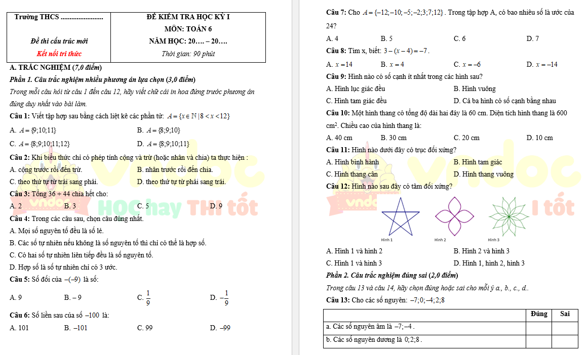 Đề thi học kì 1 môn Toán lớp 6 theo CV 7991