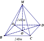 Bài 5 (TH). (0,5 điểm) Một Kim tự tháp Kheops – Ai Cập có dạng hình chóp tứ giác đều, đáy là hình vuông, các mặt bên là các tam giác cân chung đỉnh (hình vẽ bên). Biết chiều cao của kim tự tháp SO = 140 mét, cạnh đáy của nó dài BC = 240 mét. Tính thể tích của kim tự tháp.