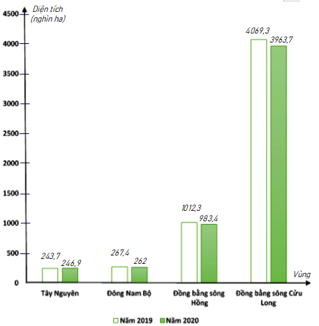 Biểu đồ cột kép ở hình bên biểu diễn diện tích gieo trồng lúa trong các năm 2019; 2020 của các vùng: Tây Nguyên; Đông Nam Bộ; Đồng bằng sông Hồng; Đồng bằng sông Cửu Long . (đơn vị : nghìn ha)
