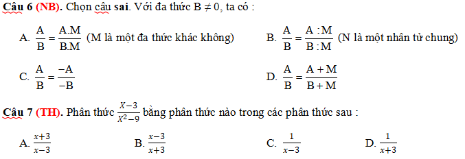Phân thức đại số. Tính chất cơ bản của phân thức đại số. Các phép toán cộng, trừ, nhân, chia các phân thức đại số |