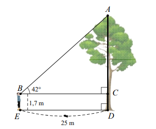 \(1,7m\). Hãy tính chiều cao của cây (làm tròn kết quả đến chữ số thập phân thứ nhất của mét).