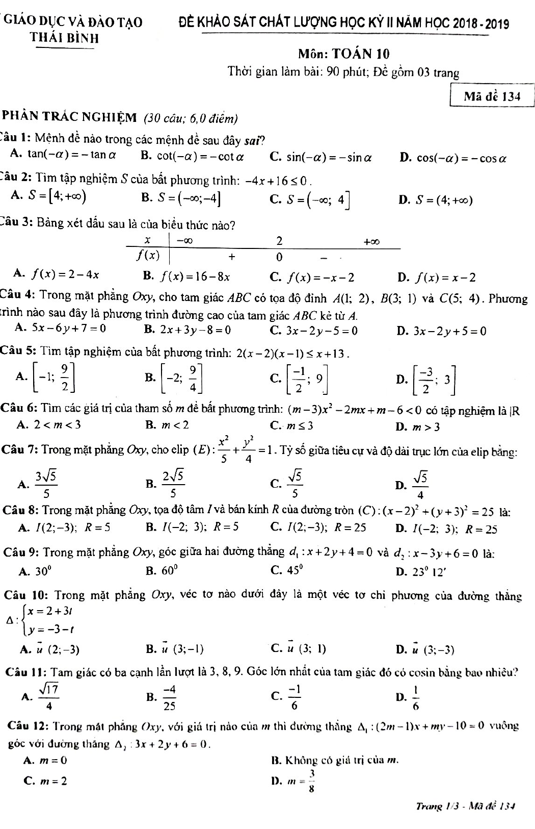Đề thi học kì 2 lớp 10 môn Toán năm 2018 - 2019 Sở GD&ĐT Thái Bình