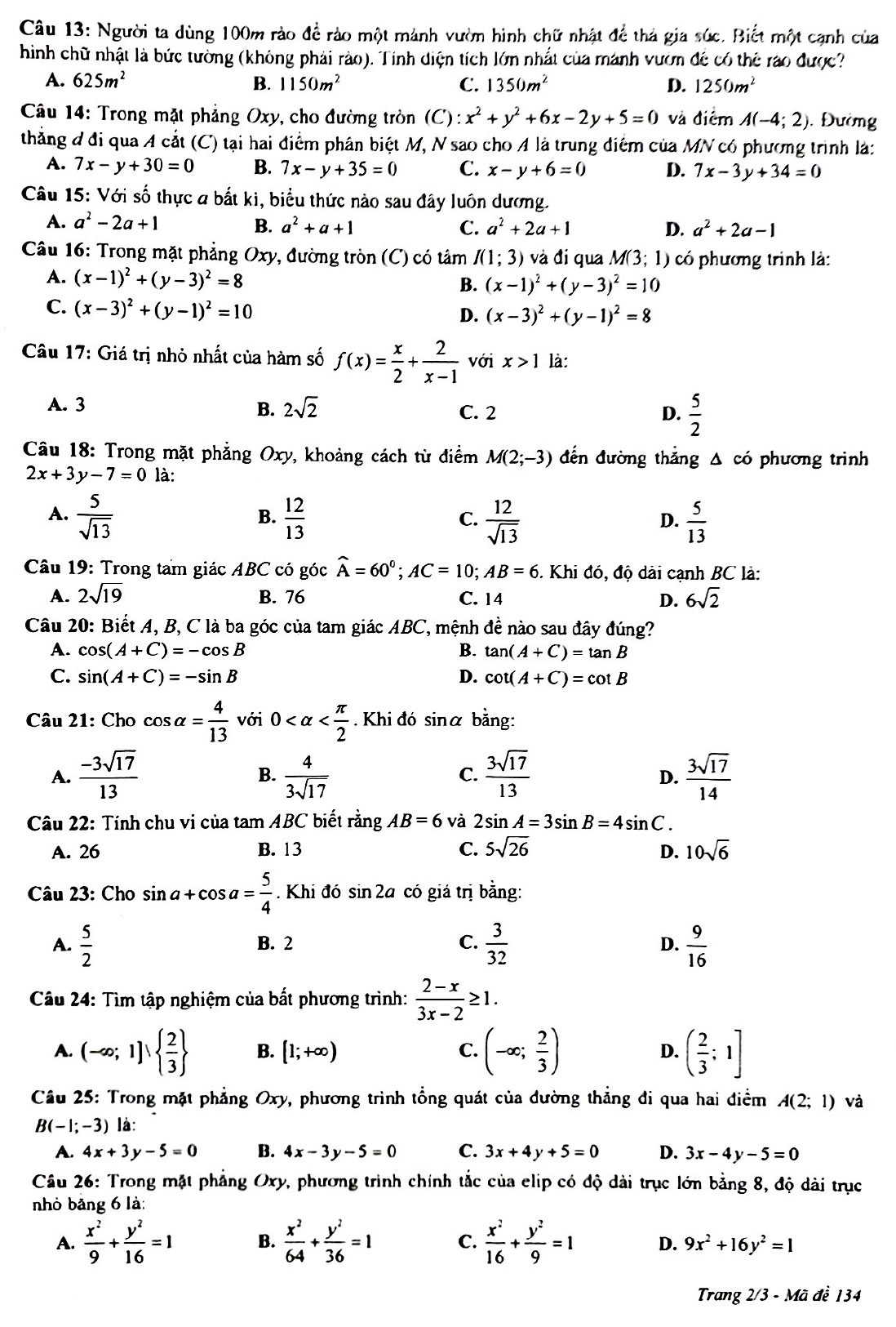 Đề kiểm tra học kì 2 lớp 10 môn Toán