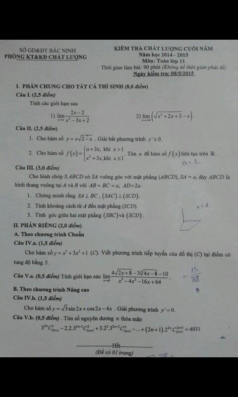 Đề thi học kì 2 lớp 11 môn Toán năm 2015 Sở GD-ĐT tỉnh Bắc Ninh