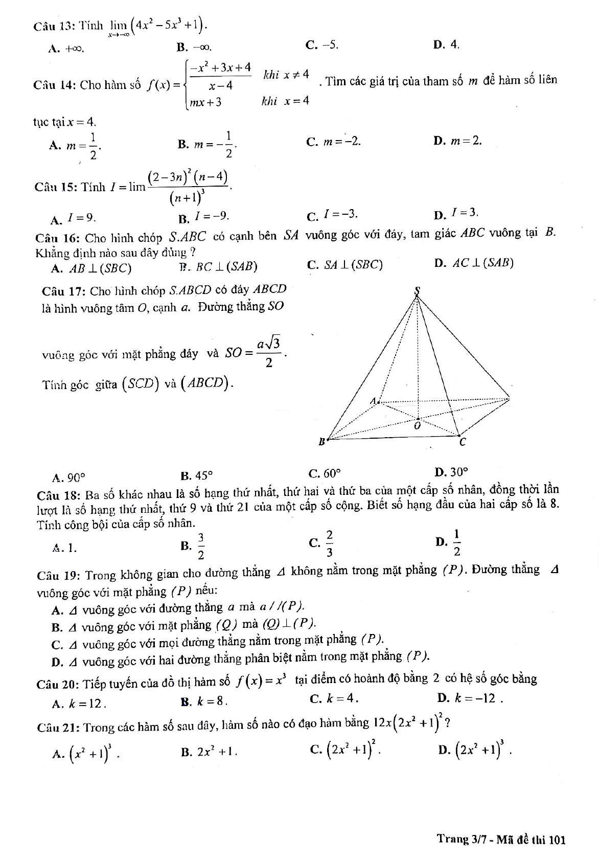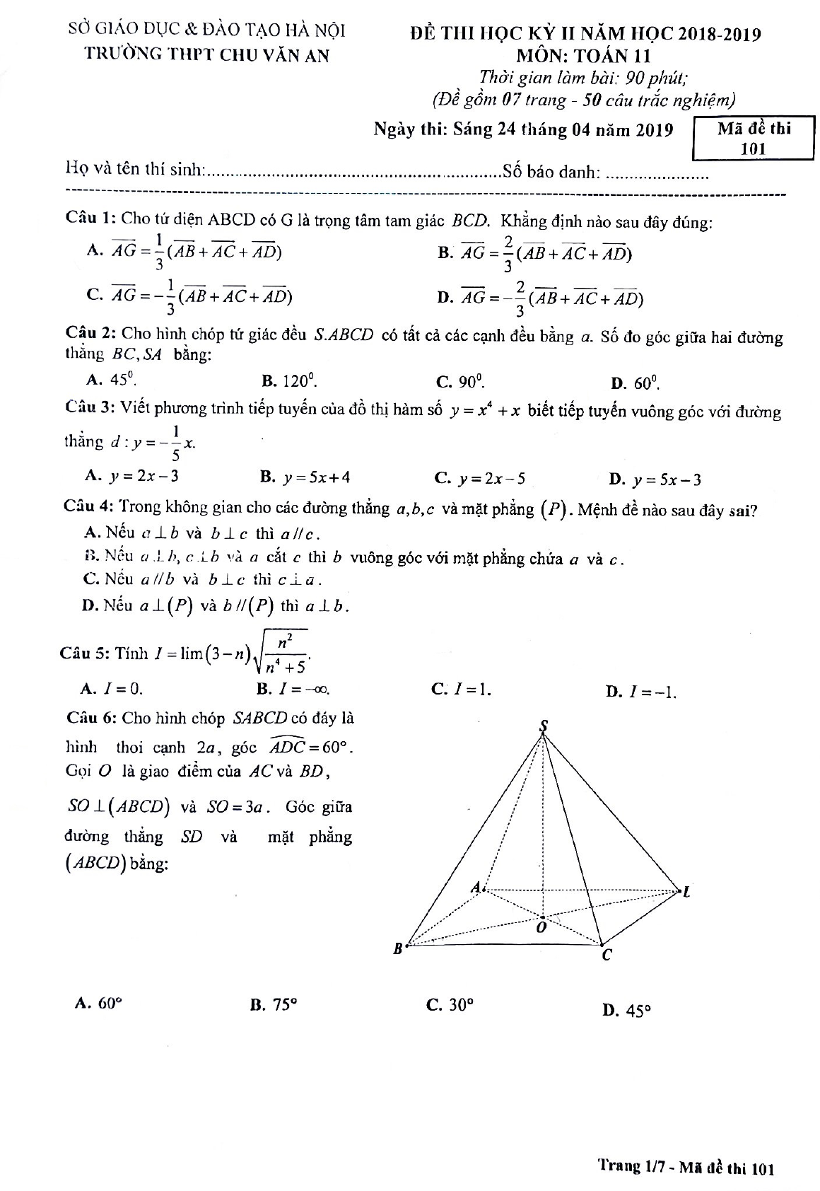 Đề thi học kì 2 lớp 11 môn Toán năm 2018 - 2019 trường THPT Chu Văn An - Hà Nội