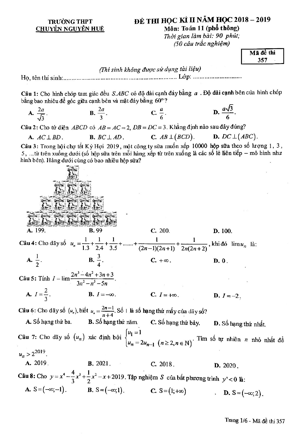 Đề thi học kì 2 lớp 11 môn Toán năm 2018 - 2019 trường THPT Chuyên Nguyễn Huệ - Hà Nội