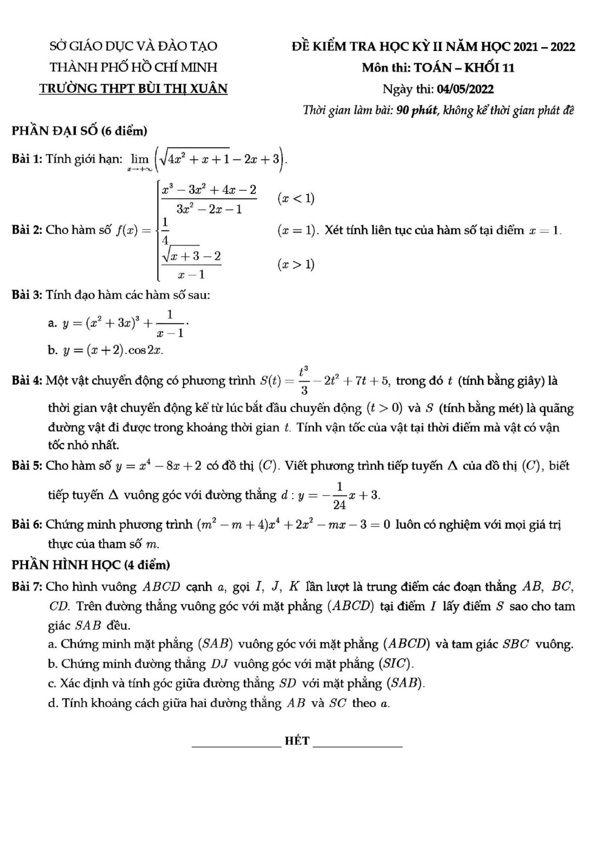 Đề thi học kì 2 lớp 11 môn Toán trường THPT Bùi Thị Xuân, TP HCM năm học 2021-2022 được biên soạn theo cấu trúc đề thi tự luận. Đề thi được tổng hợp gồm có 7 câu hỏi tự luận, thí sinh làm bài trong thời gian 90 phút.