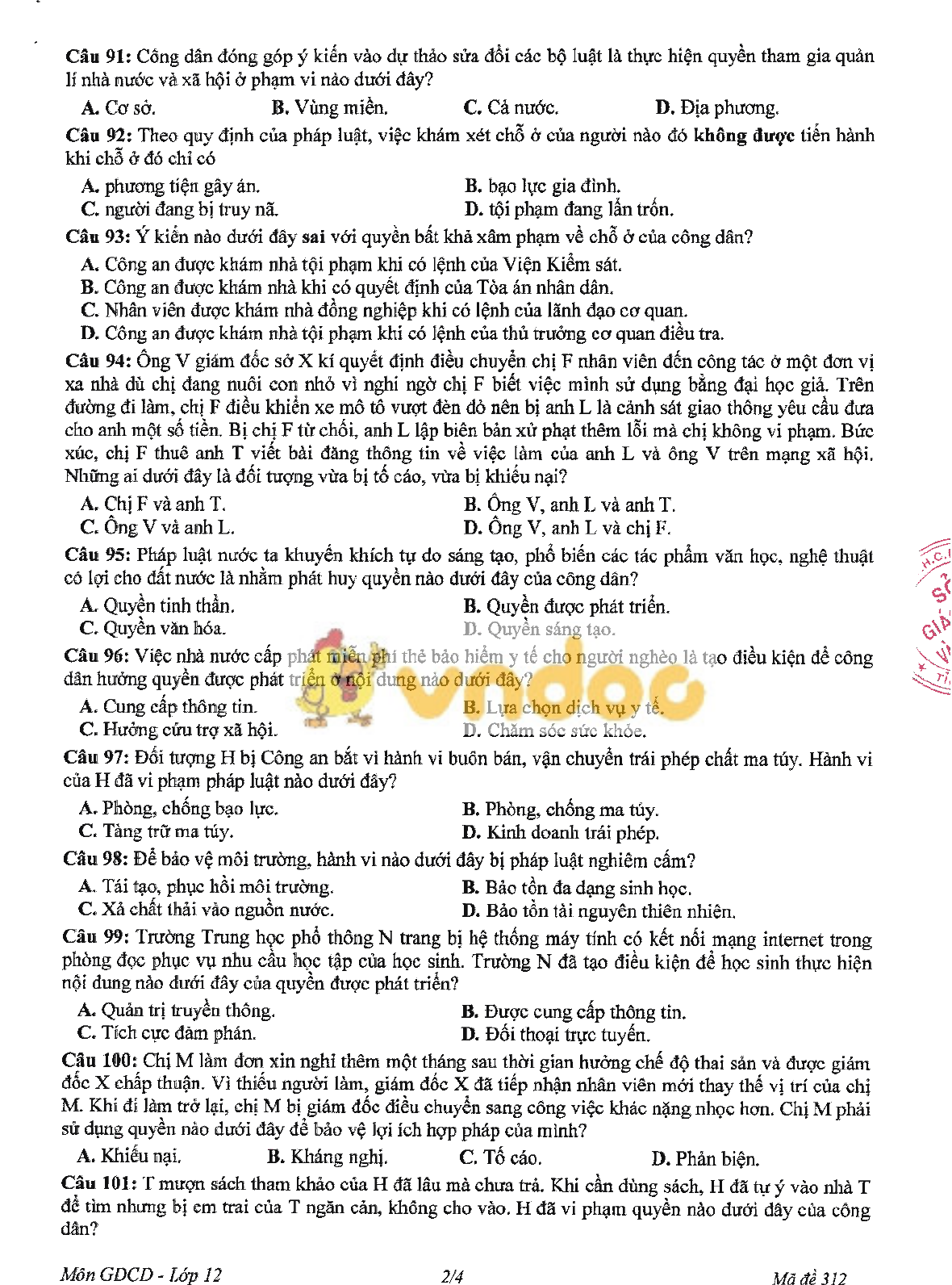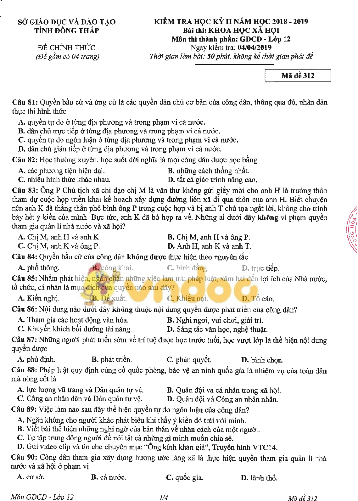 Đề thi học kì 2 lớp 12 môn GDCD năm 2018 - 2019 Sở GD&ĐT Đồng Tháp