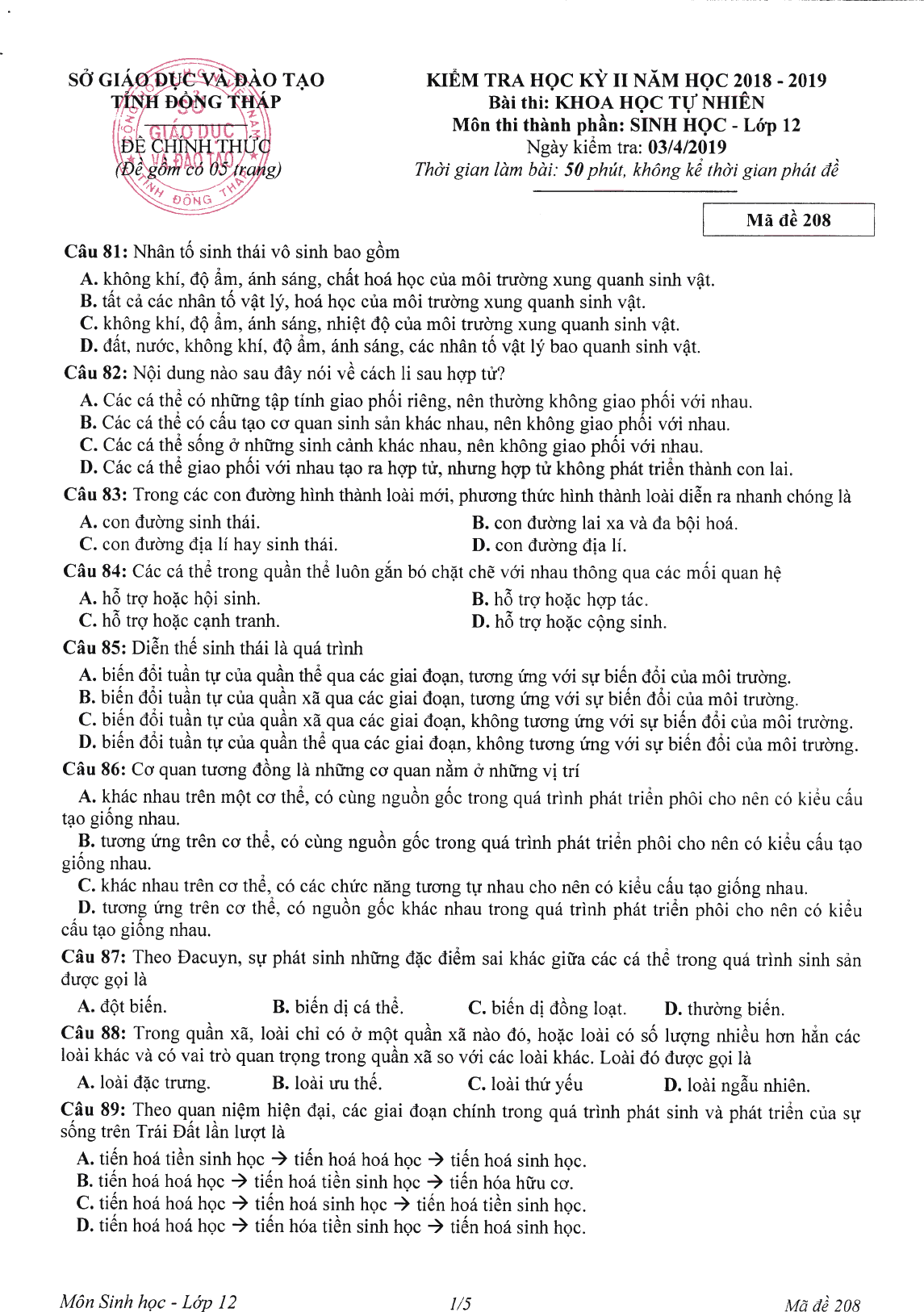 Đề thi học kì 2 lớp 12 môn Sinh học năm 2018 - 2019 Sở GD&ĐT Đồng Tháp