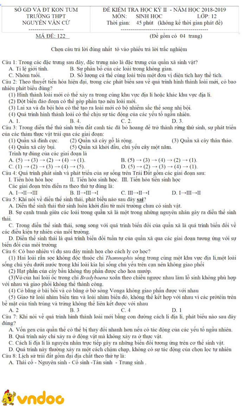 - Đề thi học kì 2 lớp 12 môn Sinh học năm 2018 - 2019 Sở GD&ĐT Đồng Tháp