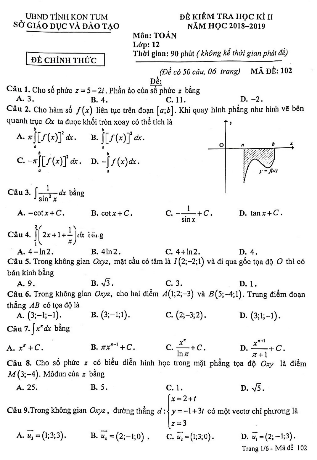 Đề thi học kì 2 lớp 12 môn Toán năm 2018 - 2019 Sở GD&ĐT Kon Tum