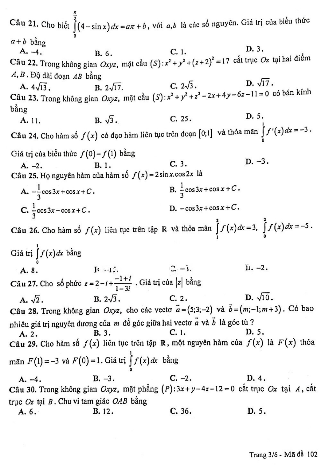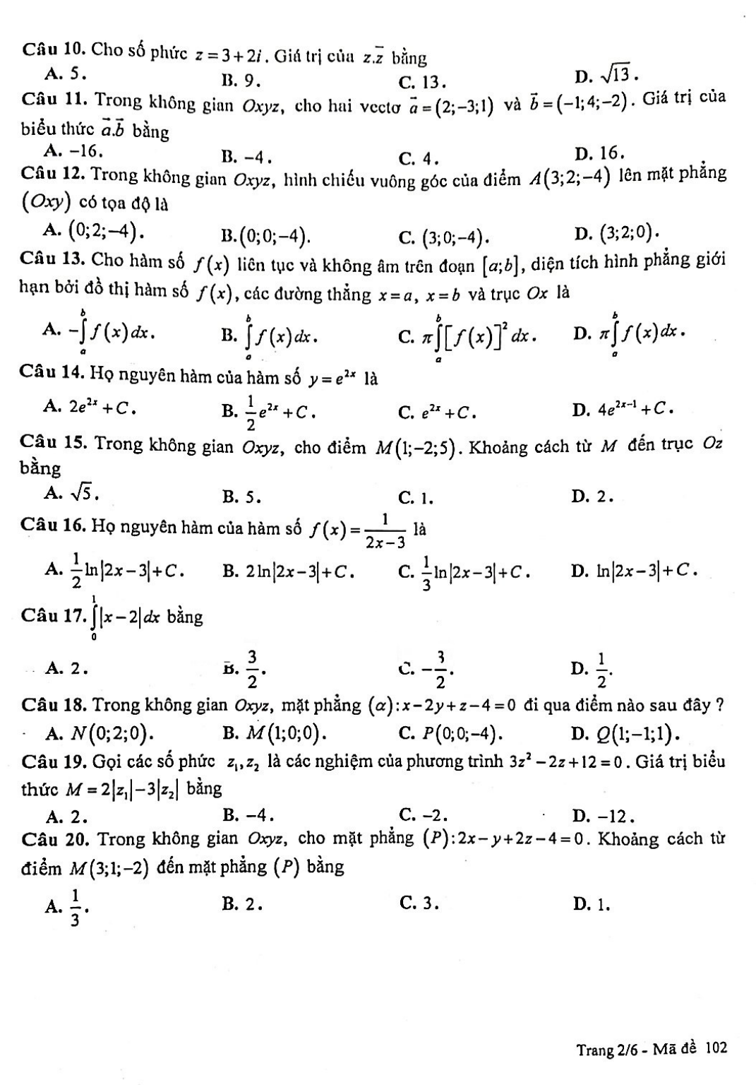 Đề thi học kì 2 lớp 12 môn Toán trắc nghiệm
