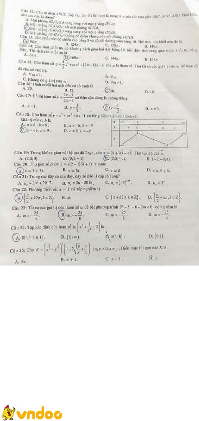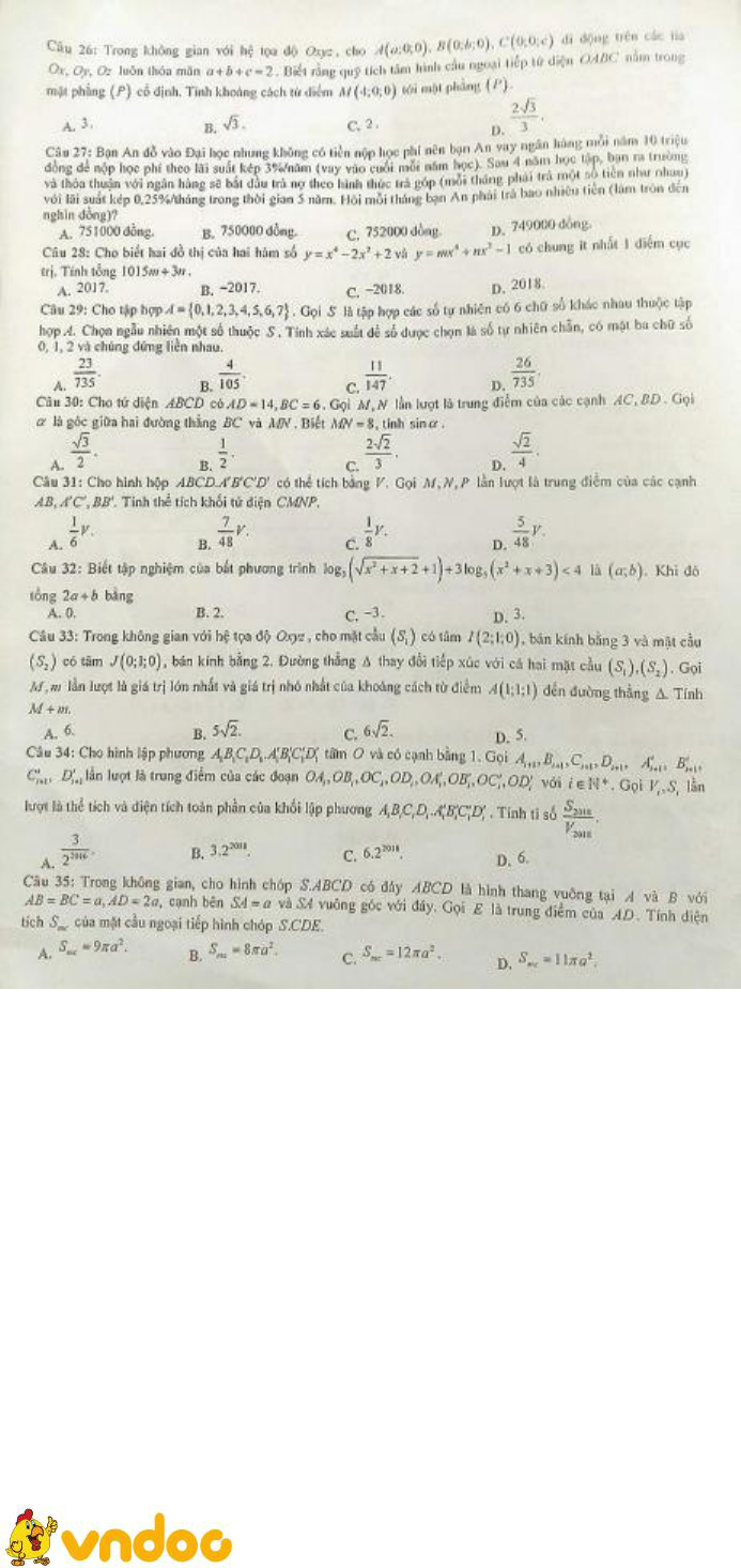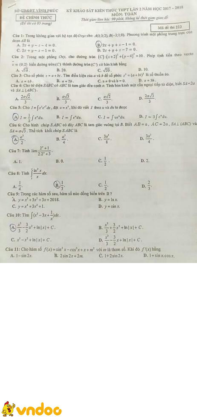 Trên đây VnDoc.com đã giới thiệu tới bạn đọc tài liệu: Đề thi học kì 2 lớp 12 môn Toán năm 2018 Sở GD&ĐT Vĩnh Phúc (Lần 2). Để có kết quả cao hơn trong học tập, VnDoc xin giới thiệu tới các bạn học sinh tài liệu Thi thpt Quốc gia môn Toán, Thi thpt Quốc gia môn Hóa học, Thi thpt Quốc gia môn Vật Lý, Thi thpt Quốc gia môn Sinh học mà VnDoc đã tổng hợp và đăng tải.