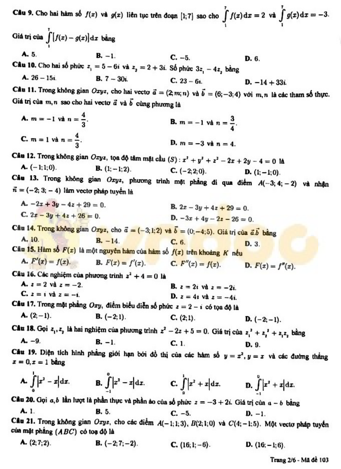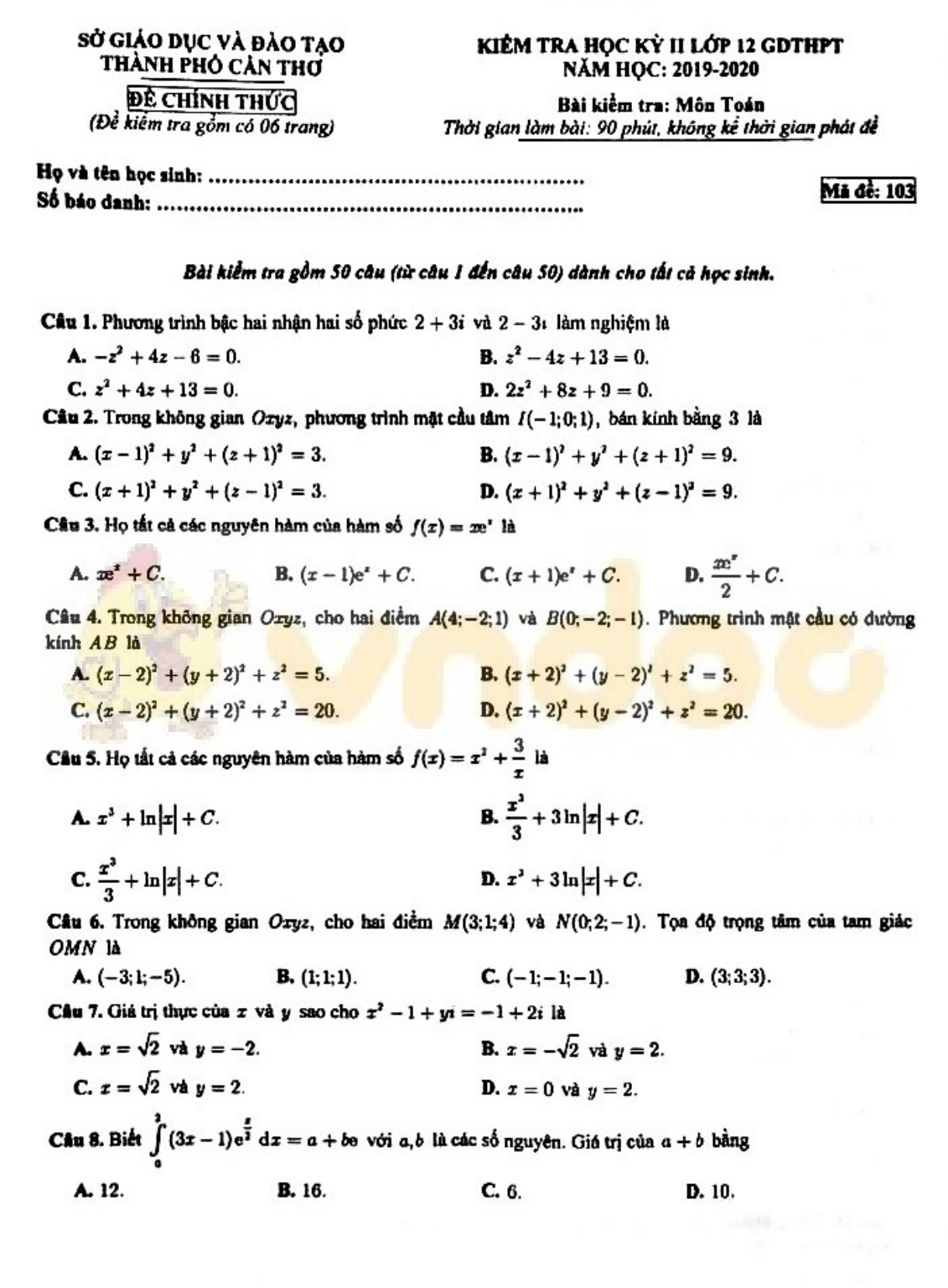 VnDoc.com xin gửi tới bạn đọc bài viết Đề thi học kì 2 lớp 12 môn Toán năm 2019-2020 Sở GD&ĐT Cần Thơ để bạn đọc cùng tham khảo. Đề thi gồm có 50 câu hỏi trắc nghiệm khách quan, thí sinh làm trong thời gian 90 phút. Mời các bạn cùng tham khảo chi tiết.