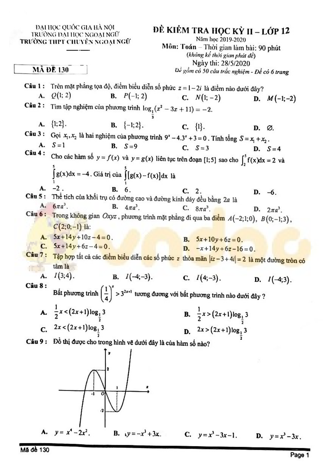 Đề thi học kì 2 lớp 12 môn Toán năm 2019-2020 trường THPT Chuyên Ngoại Ngữ, Hà Nội vừa được VnDoc.com sưu tập và xin gửi tới bạn đọc cùng tham khảo. Mong rằng qua bài viết này các bạn có thêm tài liệu để học tập, ôn tập cho thi học kì 2 và thi tốt nghiệp THPT Quốc gia sắp tới nhé. Mời các bạn cùng tham khảo chi tiết tại đây.