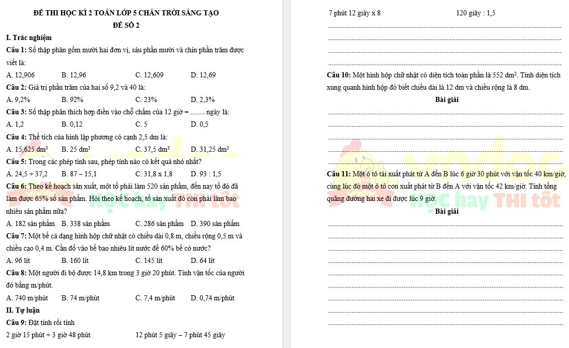 Đề thi học kì 2 lớp 5 môn Toán - Đề số 2 sách Chân trời sáng tạo do VnDoc biên soạn nhằm giúp các em ôn tập và rèn luyện các kĩ năng làm bài kiểm tra để chuẩn bị cho kì thi học kì 2 lớp 5. Đề thi gồm các dạng câu hỏi Trắc nghiệm và Bài tập được biên soạn bám sát chương trình học theo thông tư 27. Học sinh có thể làm bài trực tiếp vào đề mà không cần chuẩn bị thêm giấy ô li. Mời các em tham khảo tài liệu.