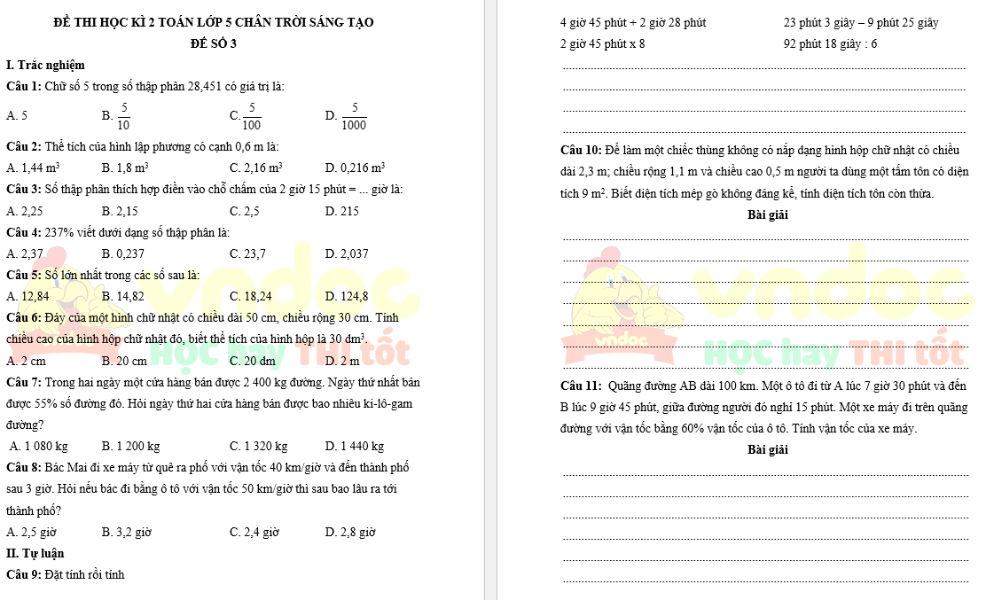Đề thi học kì 2 lớp 5 môn Toán - Đề số 3 sách Chân trời sáng tạo do VnDoc biên soạn nhằm giúp các em ôn tập và rèn luyện các kĩ năng làm bài kiểm tra để chuẩn bị cho kì thi học kì 2 lớp 5. Đề thi gồm các dạng câu hỏi Trắc nghiệm và Bài tập được biên soạn bám sát chương trình học theo thông tư 27. Học sinh có thể làm bài trực tiếp vào đề mà không cần chuẩn bị thêm giấy ô li. Mời các em tham khảo tài liệu.