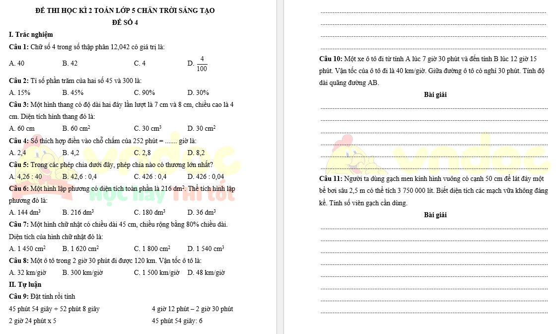 Đề thi học kì 2 lớp 5 môn Toán - Đề số 4 sách Chân trời sáng tạo do VnDoc biên soạn nhằm giúp các em ôn tập và rèn luyện các kĩ năng làm bài kiểm tra để chuẩn bị cho kì thi học kì 2 lớp 5. Đề thi gồm các dạng câu hỏi Trắc nghiệm và Bài tập được biên soạn bám sát chương trình học theo thông tư 27. Học sinh có thể làm bài trực tiếp vào đề mà không cần chuẩn bị thêm giấy ô li. Mời các em tham khảo tài liệu.