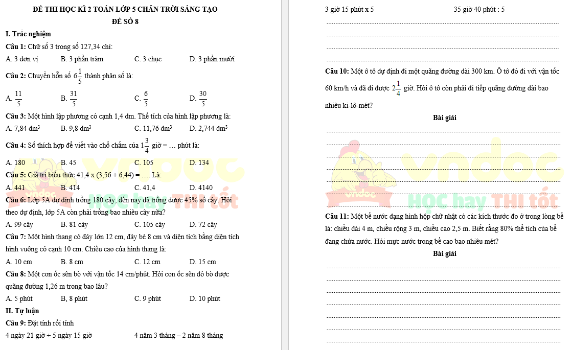 >> Tiếp theo: Đề thi học kì 2 lớp 5 môn Toán Chân trời sáng tạo - Đề số 9