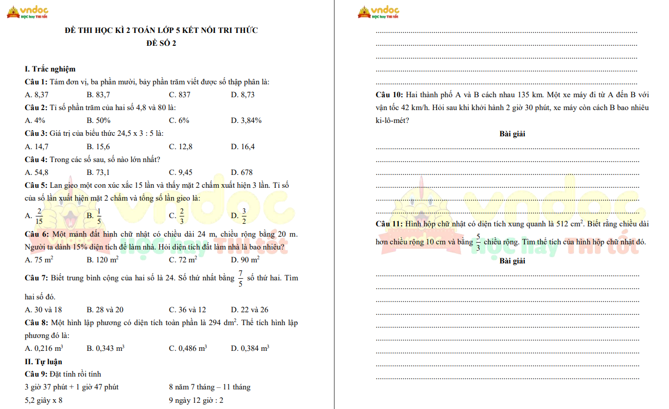 Đề thi học kì 2 Toán lớp 5 - Đề số 2 sách Kết nối tri thức do VnDoc biên soạn nhằm giúp các em ôn tập và rèn luyện các kĩ năng làm bài kiểm tra để chuẩn bị cho kì thi học kì 2 lớp 5. Mời các em tham khảo tài liệu.