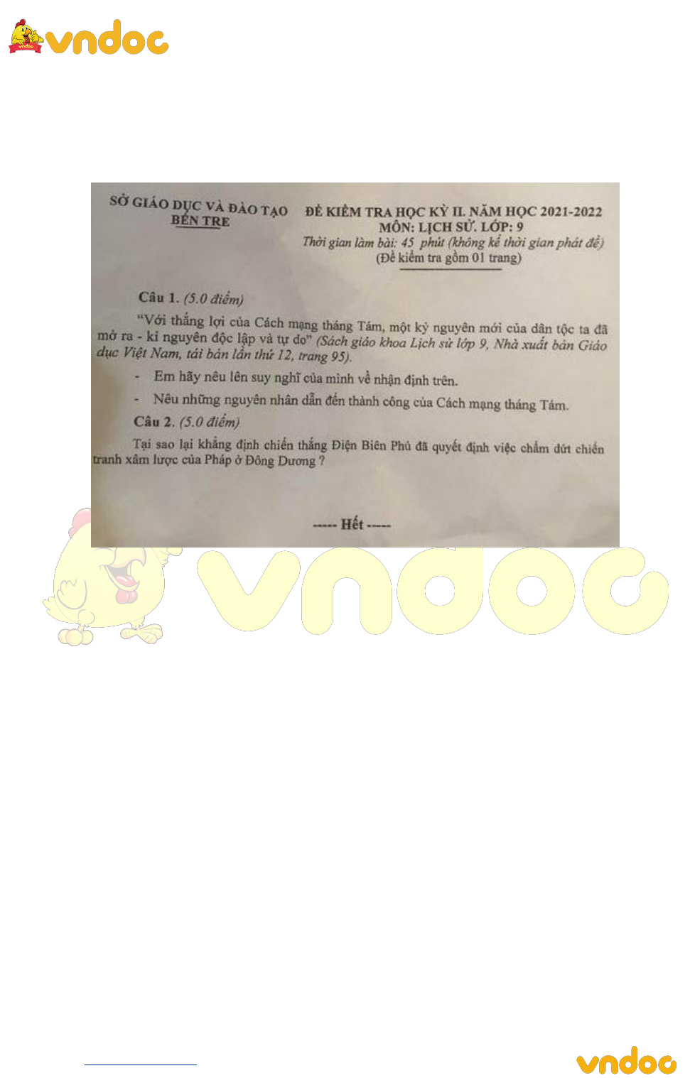Đề thi học kì 2 lớp 9 môn Lịch sử Sở GD&ĐT Bến Tre năm học 2021-2022 vừa được VnDoc.com sưu tầm và xin gửi tới bạn đọc cùng tham khảo. Hi vọng qua bài viết bạn đọc có thêm nhiều tài liệu để ôn tập thật tốt cho kì thi học kì 2 sắp tới nhé. Mời các bạn cùng tham khảo chi tiết bài viết dưới đây.