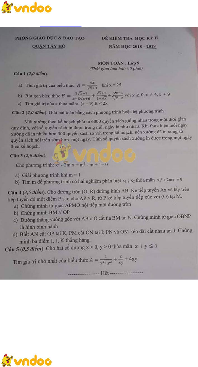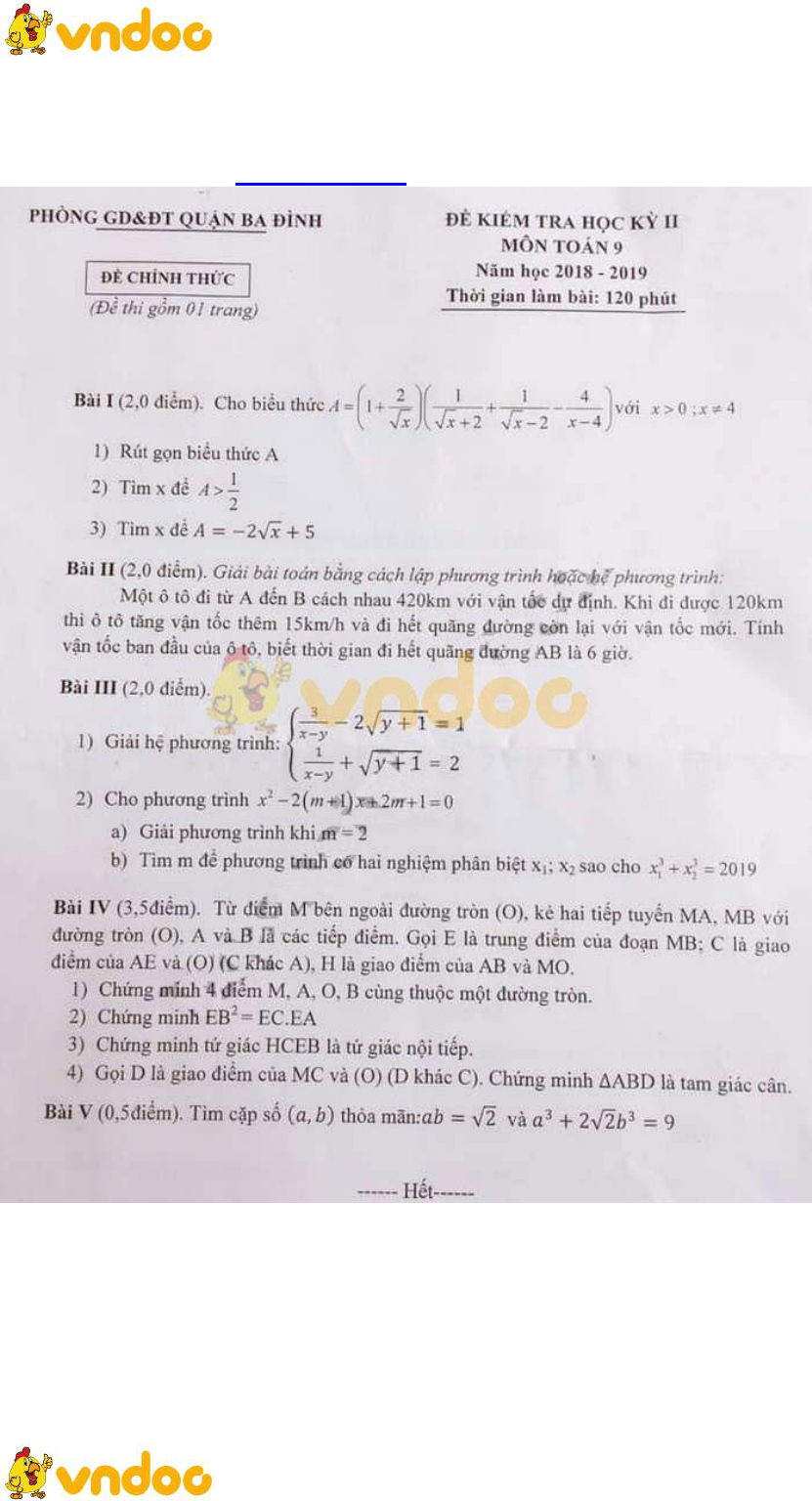 Đề thi học kì 2 lớp 9 môn Toán các trường THCS TP. Hà Nội năm 2018 - 2019 được VnDoc sưu tầm và chia sẻ trên đây, nhằm giúp các bạn học sinh có thêm nhiều đề cương ôn thi HK II lớp 9 môn Toán đồng thời là tài liệu tham khảo hữu ích dành cho thầy cô trong quá trình giảng dạy, ôn luyện kiến thức đã học cho các bạn đồng thời cũng giúp học sinh làm quen nhiều dạng đề kiểm tra Toán lớp 9 khác nhau. Mời các bạn tham khảo