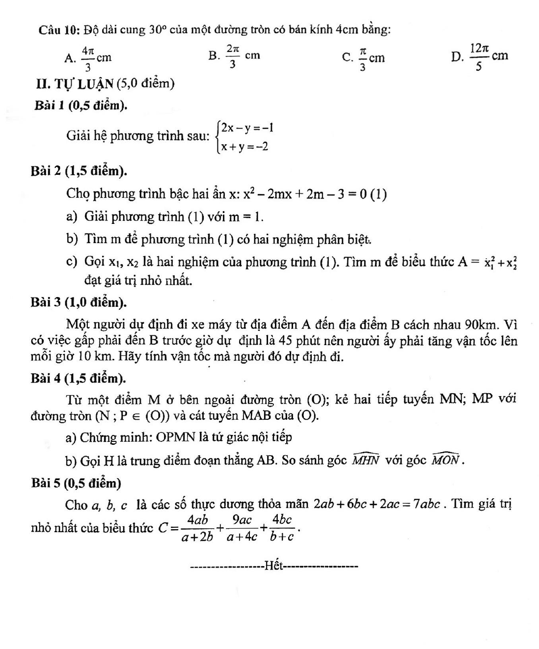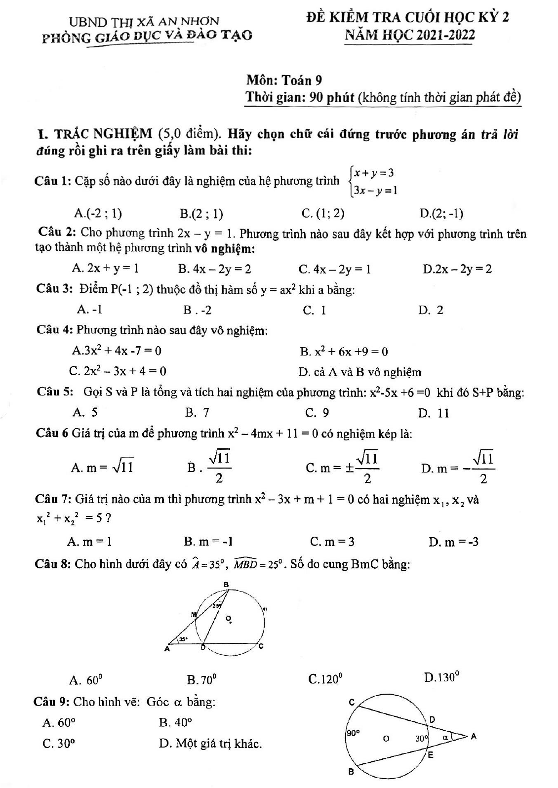 Đề thi học kì 2 lớp 9 môn Toán Phòng GD&ĐT An Nhơn, Bình Định năm học 2021-2022 được biên soạn theo cấu trúc đề thi trắc nghiệm kèm tự luận. Thí sinh làm bài trong thời gian 90 phút. Đề thi tổng hợp cách giải phương trình và hệ phương trình, chứng minh tứ giác nội tiếp.