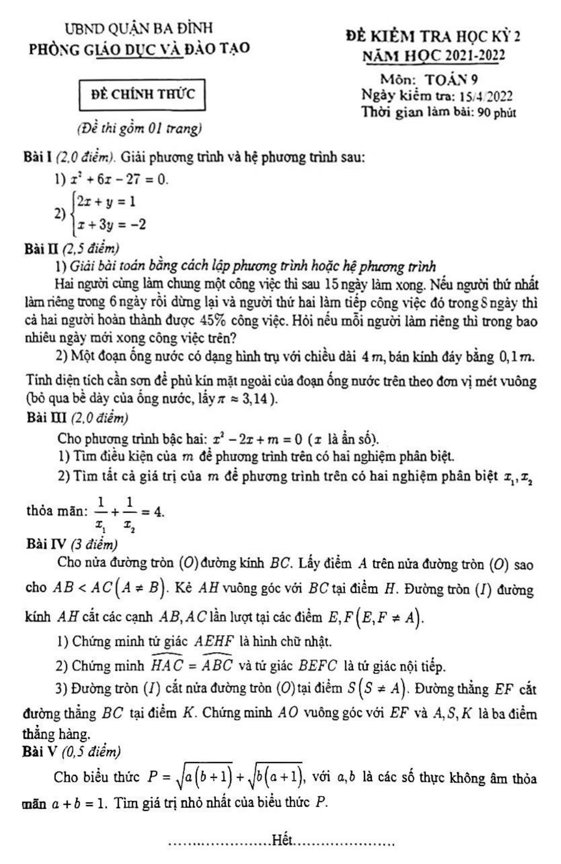 Đề thi học kì 2 lớp 9 môn Toán phòng GD&ĐT Ba Đình, Hà Nội năm 2022
