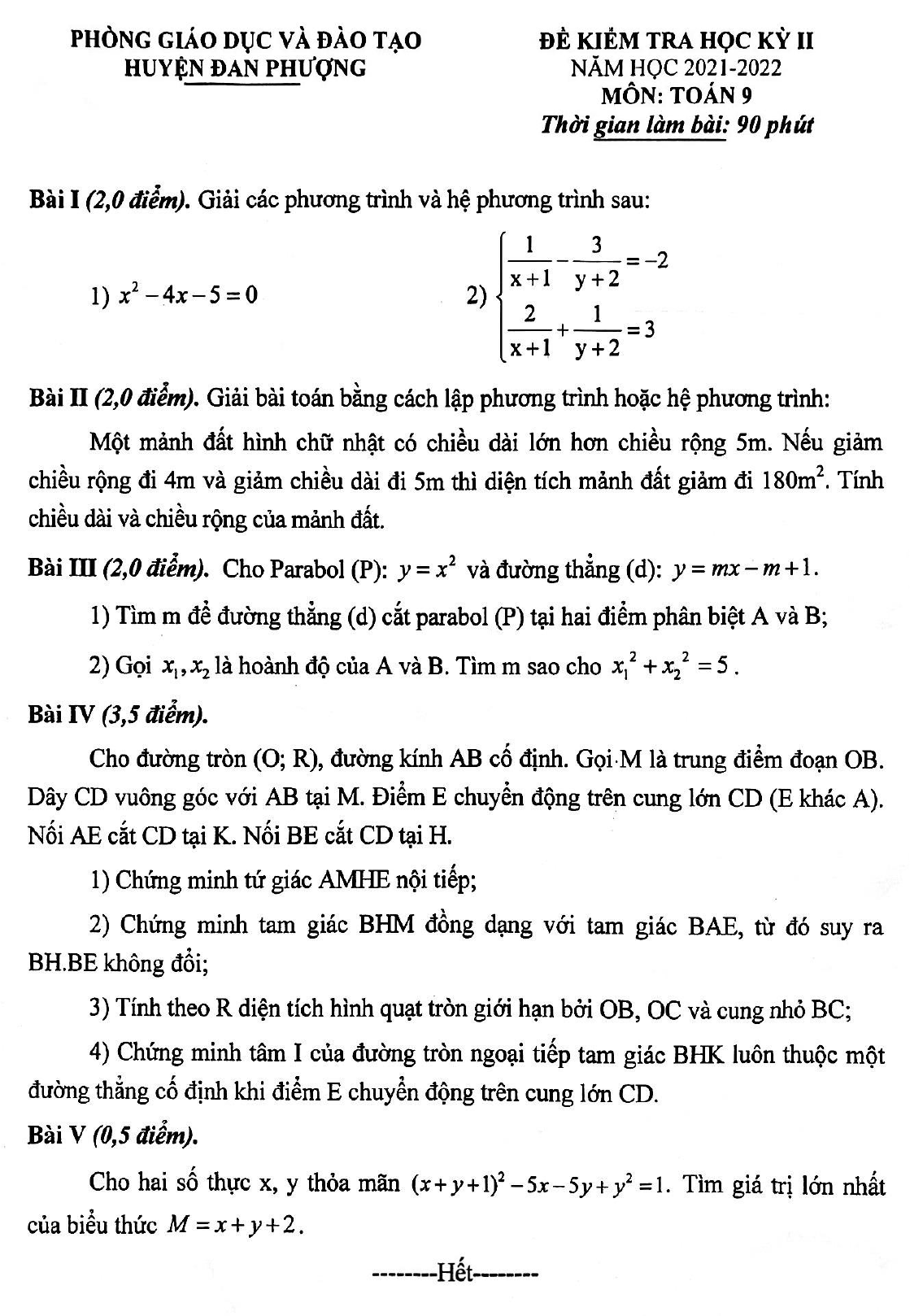 Đề thi học kì 2 lớp 9 môn Toán phòng GD&ĐT Đan Phượng, Hà Nội năm học 2021-2022