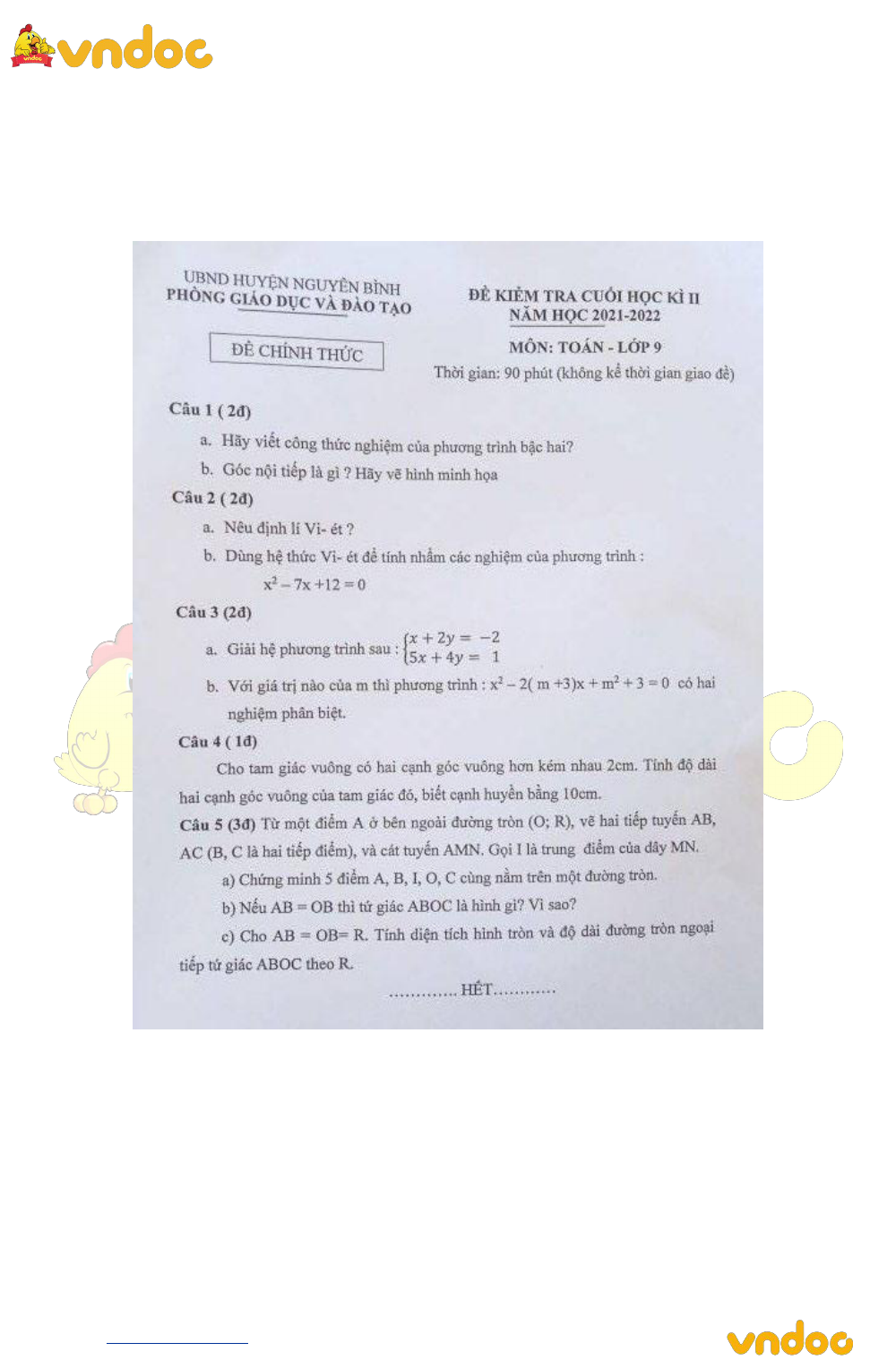 Đề thi học kì 2 lớp 9 môn Toán Phòng GD&ĐT Nguyên Bình, Cao Bằng năm học 2021-2022 vừa được VnDoc.com sưu tầm và xin gửi tới bạn đọc cùng tham khảo. Hi vọng qua bài viết bạn đọc có thêm nhiều tài liệu để ôn tập thật tốt cho kì thi học kì 2 sắp tới nhé. Mời các bạn cùng tham khảo chi tiết và tải về bài viết dưới đây nhé.