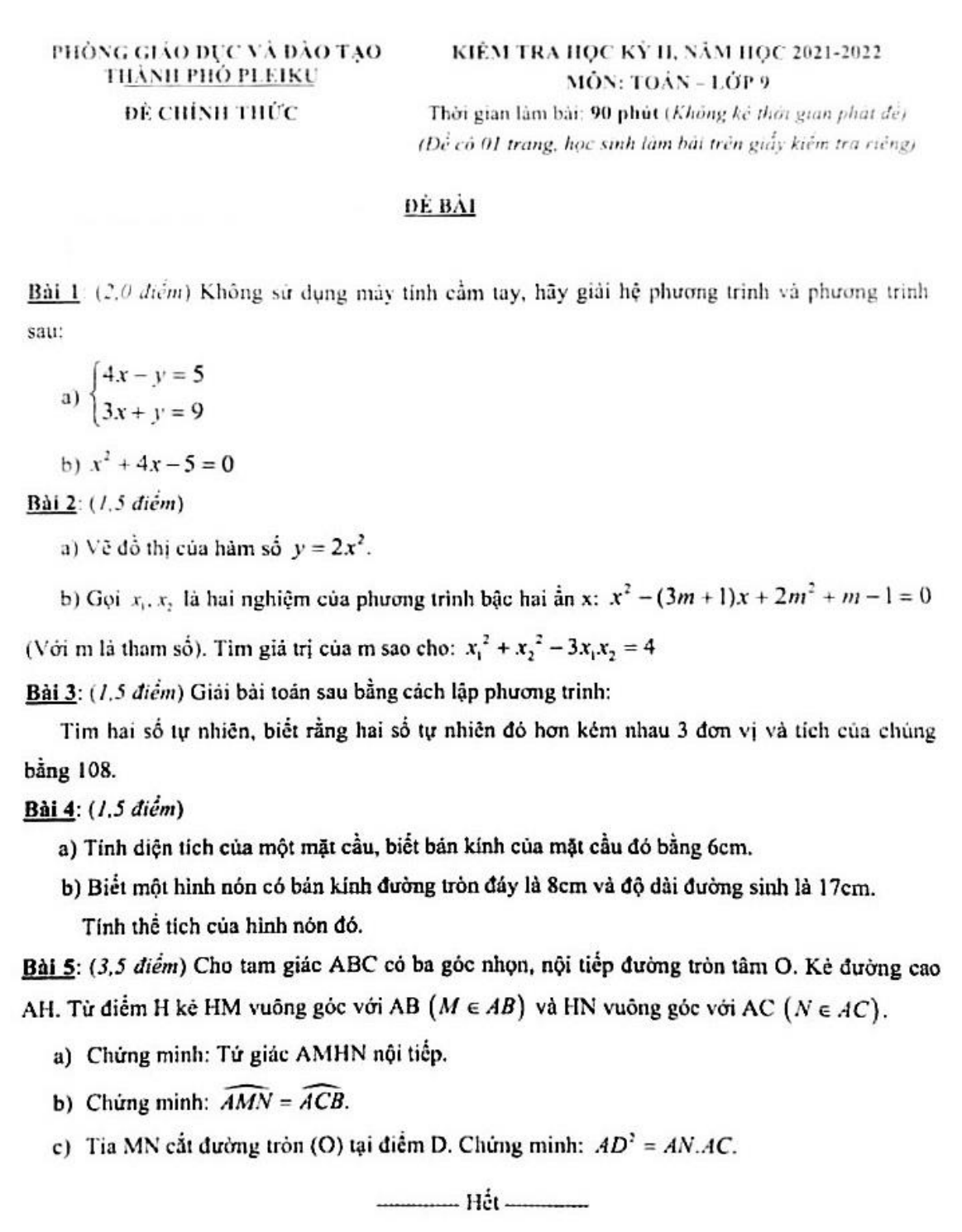 Đề thi học kì 2 lớp 9 môn Toán Phòng GD&ĐT Pleiku, Gia Lai năm học 2021-2022